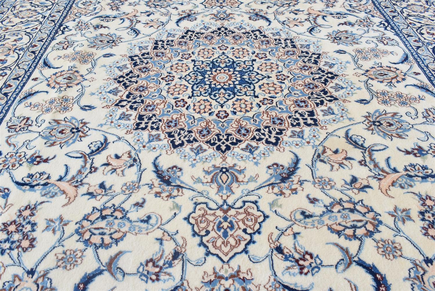 A SUPERFINE PERSIAN NAIEN CARPET, SILK INLAYS WITHIN A WOOL PILE IN PRISTINE CONDITION, FINELY HAND KNOTTED FARAHANI ATELIER WEAVE OF 500,000 KNOTS PER SQUARE METRE, CLASSIC NAIEN DESIGN OF BOLD SUNBURST MEDALLION AND QUARTERED CORNER MEDALLIONS IN AN IVORY FIELD OF SHAH ABBASSI PALMETTES, BLOSSOMING FLORAL SPRAYS AND SAZ LEAVES, MAJOR BORDER OF PALMETTES AND SAZ LEAVES, SIZE 300 X 200 CM, ORIGIN IRAN, RRP $11,000