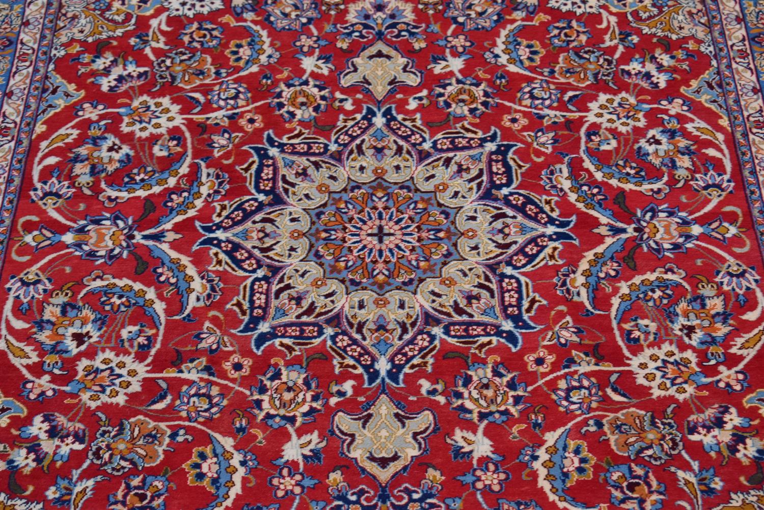 A FINE PERSIAN ISFAHAN CARPET, 100% SOLID AND DENSE WOOL IN EXCELLENT CONDITION, FINELY HAND KNOTTED ISFAHAN WEAVE WITH CLASSIC DESIGN OF FLORAL MEDALLION AND QUARTERED CORNER MEDALLIONS IN A RED FIELD OF SHAH ABBASSI PALMETTES, FLORAL MOTIFS AND BOLD SAZ LEAVES, BORDER OF SHAH ABBASI PALMETTES AND FLORAL MOTIFS, SIZE 335 X 212 CM, ORIGIN IRAN, RRP $5,200