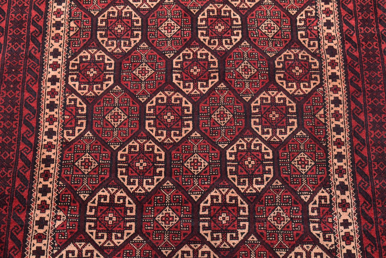 A TRIBAL PERSIAN TURKOMAN RUG, 100% WOOL IN EXCELLENT CONDITION, FINELY HAND KNOTTED TRIBAL WEAVE FROM THE KHORASAN PROVINCE WITH TRIBAL DESIGN OF ALL OVER HEXAGONAL PANELS CONTAINING TRIBAL AMULETS, SIZE 228 X 122 CM, ORIGIN IRAN, RRP $1,500