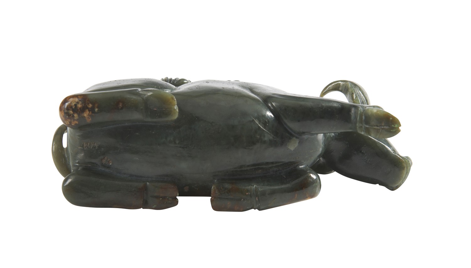 Modelled as a boy on the back of a recumbent buffalo, the jade of dark greyish green colour with russet skin showing to the front. Together with a fitted hardwood stand.