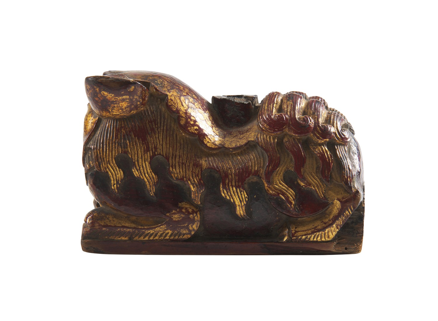 Carved in the form of a recumbent guardian lion, with red lacquer and remnant gilding.