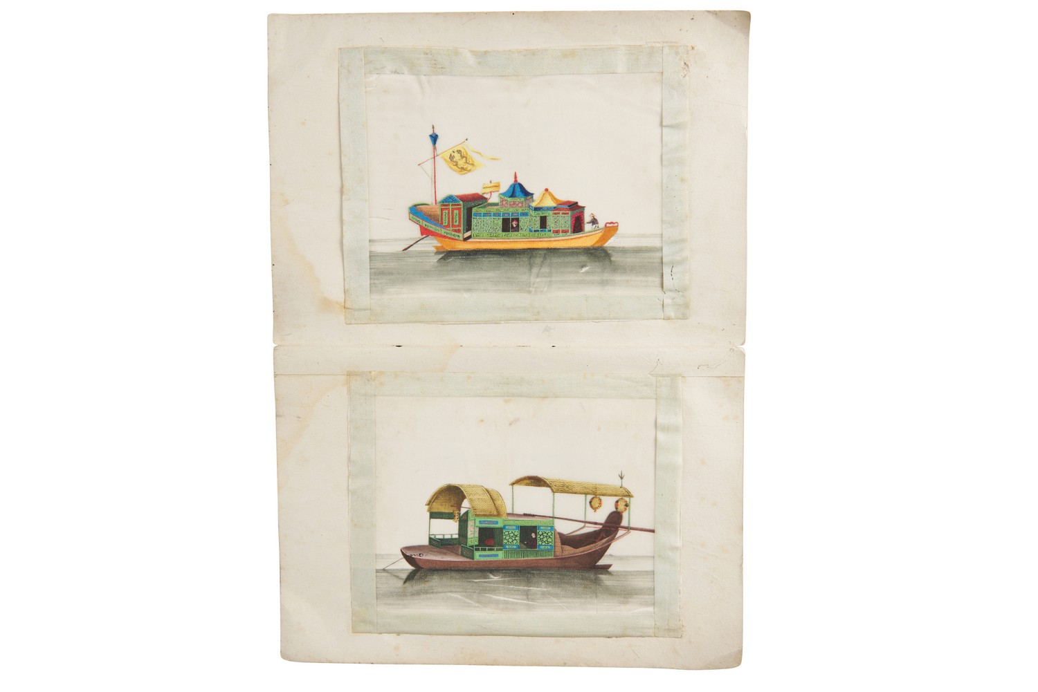 The leporello format brocade covered album with paintings on both sides, one side with court figures, the other with junks and pleasure boats. 24 images in total, each measuring 14cm x 9cm.