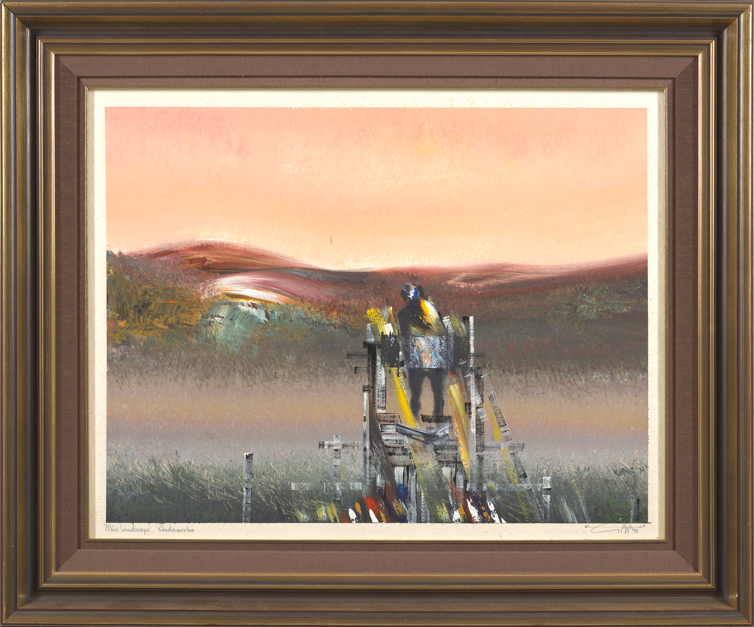In fair condition. The work displays brown spots, mostly in the outer area of the paper beyond the pigment. Very minor spots within the image. No visible tears, although the work is laid down. The work is framed, with no glass. Frame bears minor scratches and marks.