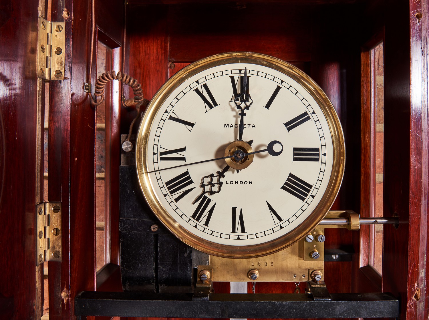 The mahogany case with glazed door to upper section, fixed hood with shallow arch to top, stepped plinth base below glazed door. The painted dial signed Magneta- London. The movement of eight day duration with single weight driving the escapement through a remontoir system whilst driving a magneto to be impulsed each minute with such speed as to generate enough power to power sixty salve clocks. Side wound movement