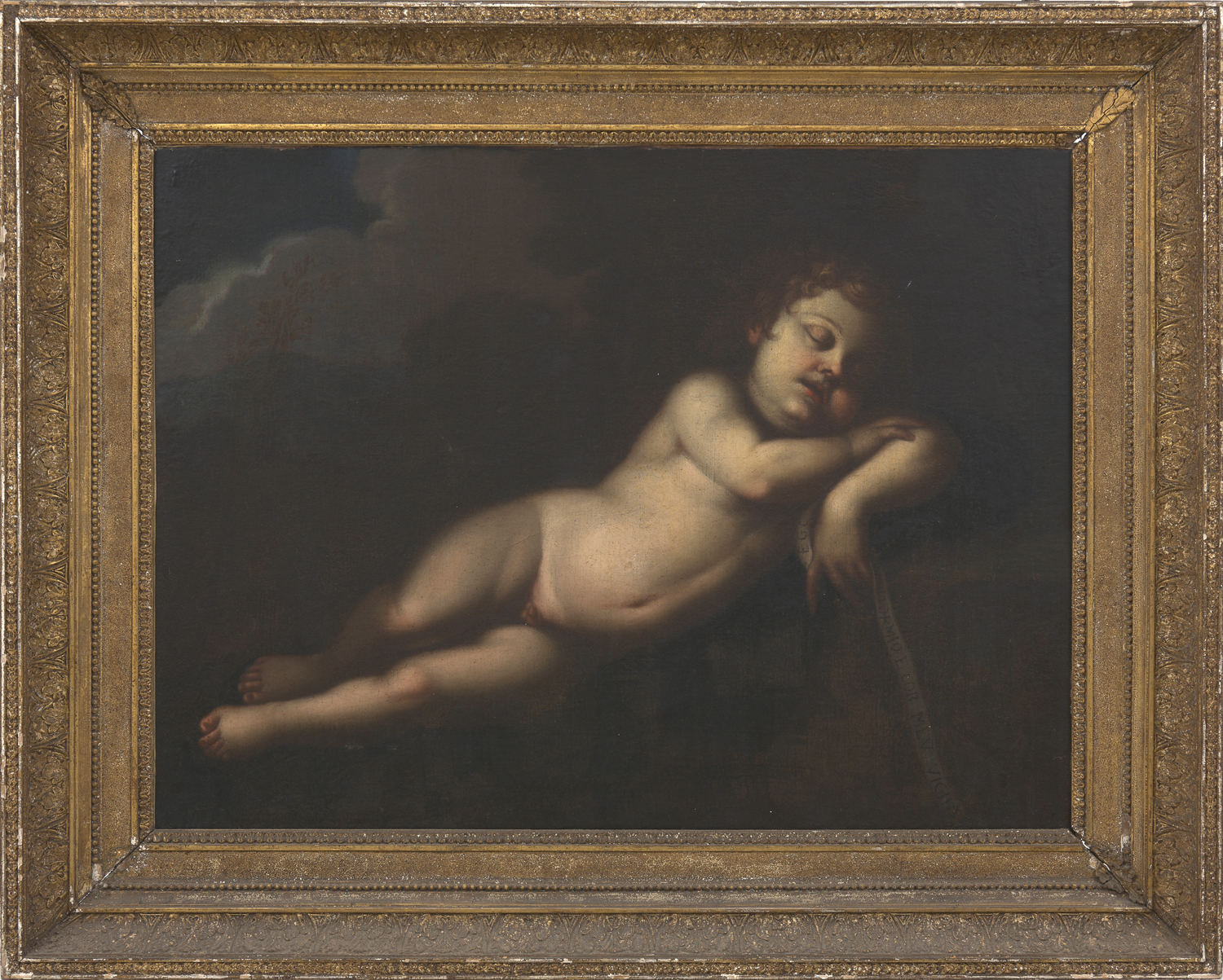 Work is sound and stable condition. Under a UV light, it can be reported that the surface has been heavily restored with with over 50% of the black pigment showing fill in. The subject body and skin coloured pigment has not been touched. Craquelure and hairline splits in the paint are present on the surface also. Work is well framed (framed is very delicate).