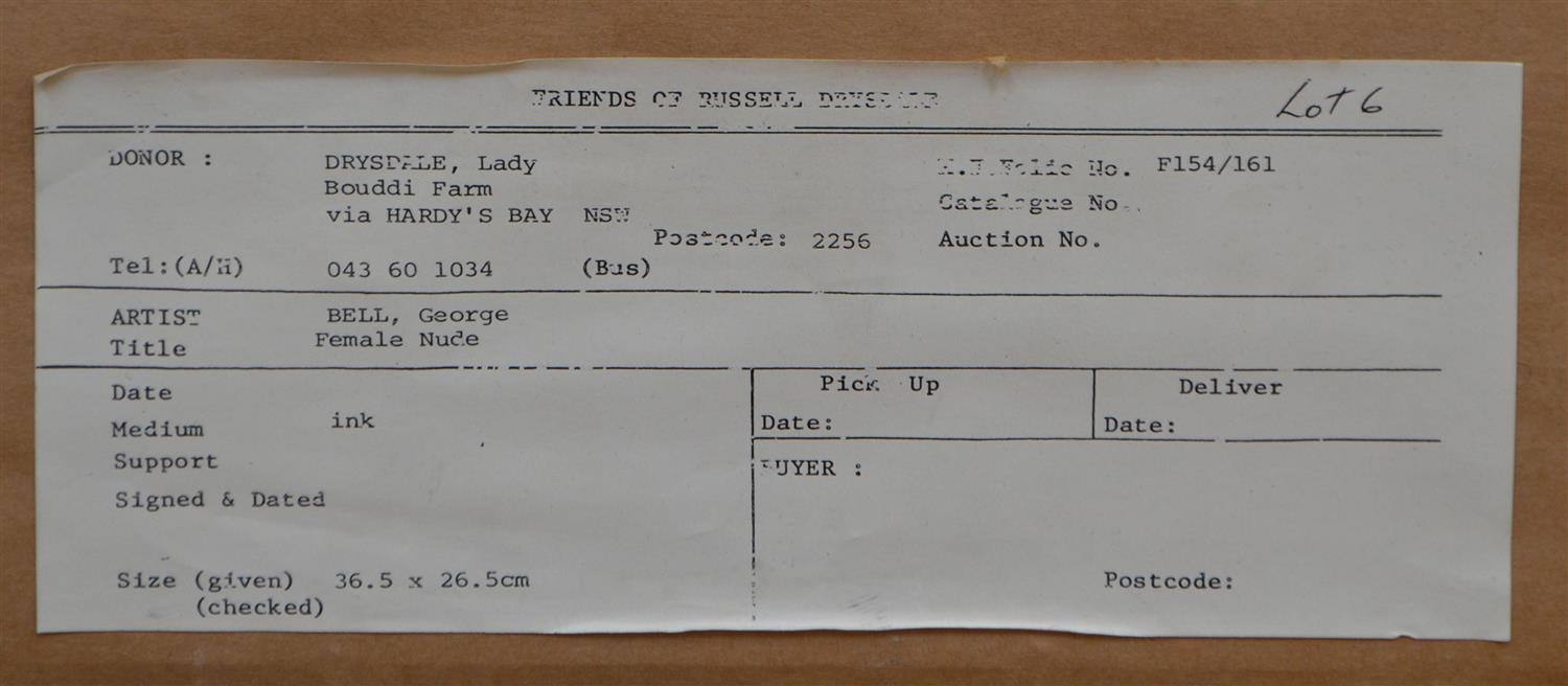 GEORGE BELL, NUDE, INK ON PAPER, 36 X 26CM, FRAME SIZE: 56 X 44CM, CONDITION: CREASE APPROX. 26CM, LIGHT FOXING EVIDENT, OVERALL DISCOLOURATION OF PAPER, SOME LIGHT AREAS OF STAINING