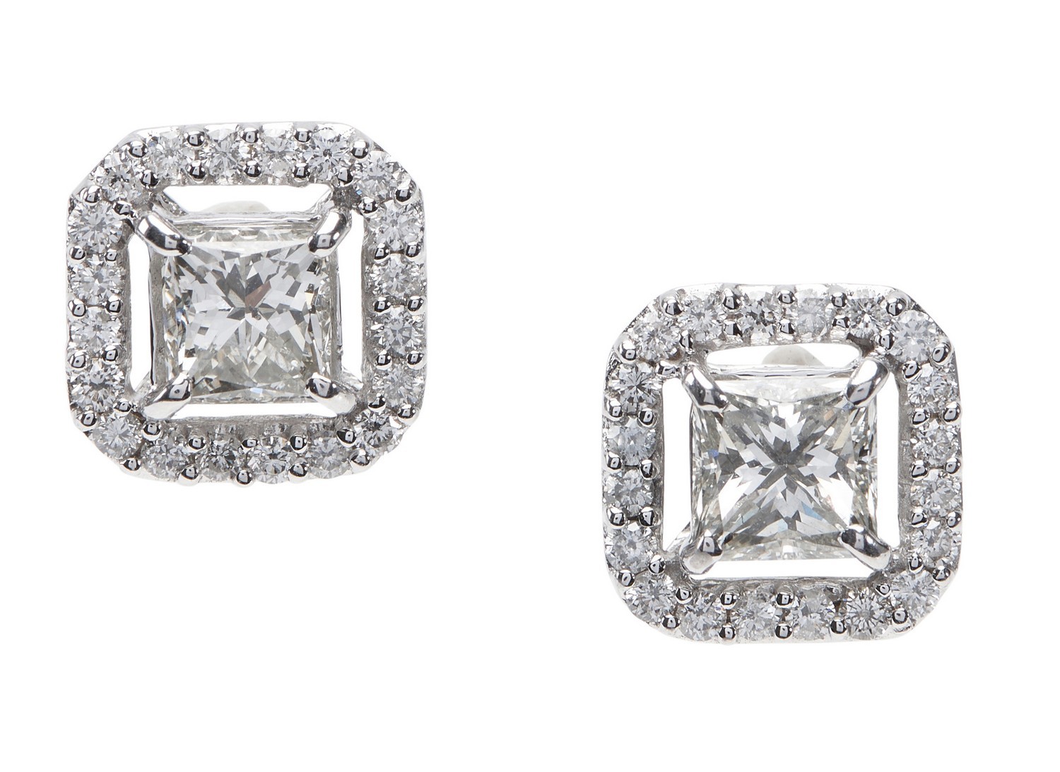 Each earring comprising a princess cut diamond weighing 1.03cts, within a surround of round brilliant cut diamonds, in 18ct white gold.
