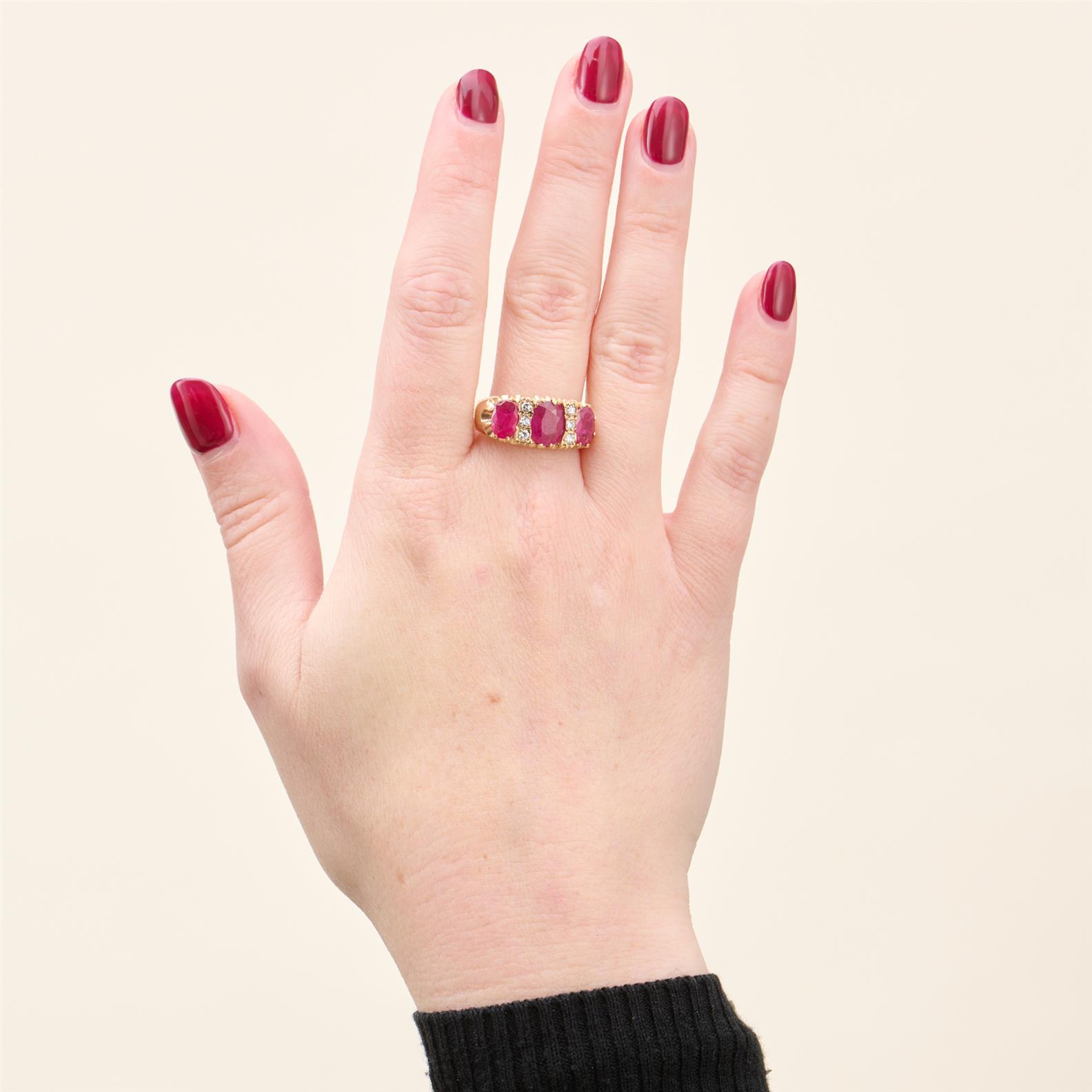 Of half hoop design, comprising three oval cut-rubies totalling 3.40 carats, spaced by single-cut diamonds, ring size P, London hallmarks circa 1972-73.