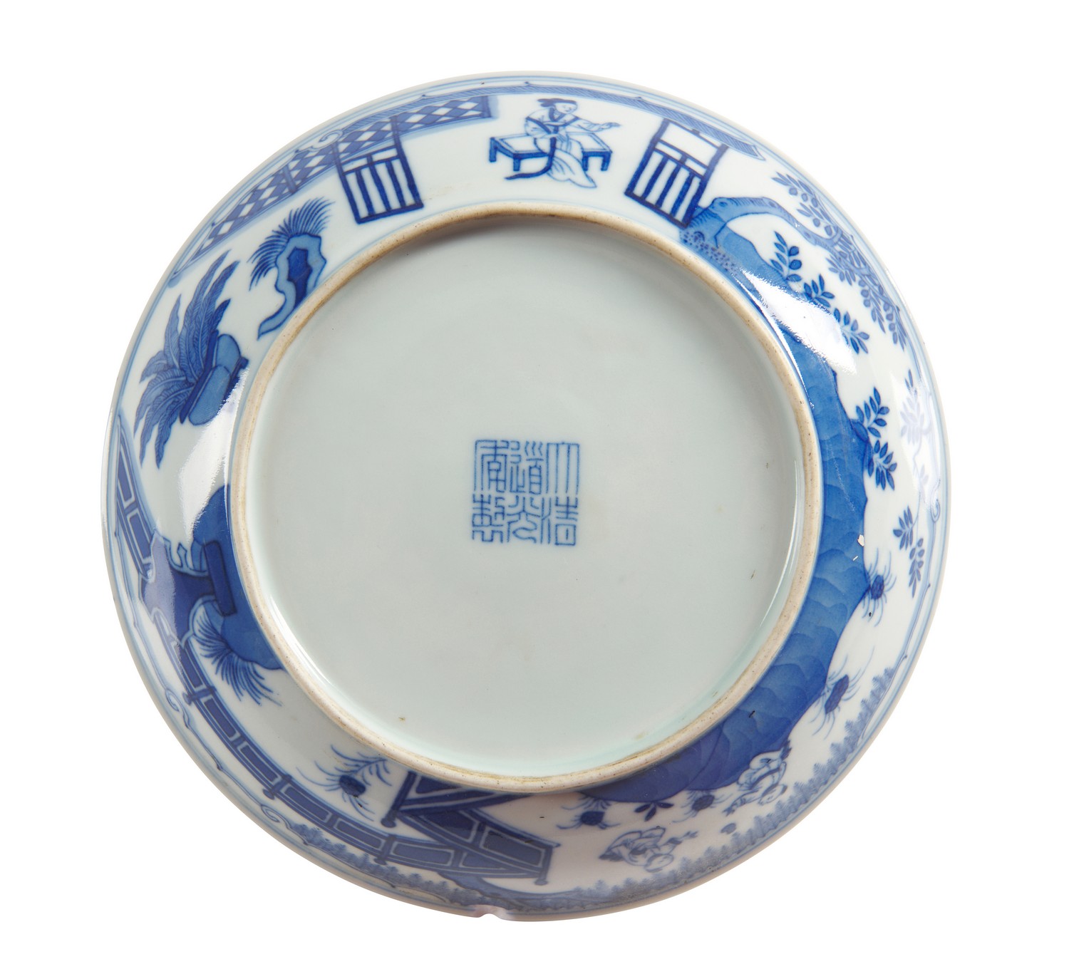 Decorated to the interior with a roundel of pine, plum, bamboo, rocks and lingzhi fungus, the exterior decorated with a garden scene of boys playing under the watchful gaze of a seated lady. Six character mark for Daoguang to the base. Together with a 19th century fitted hardwood stand.