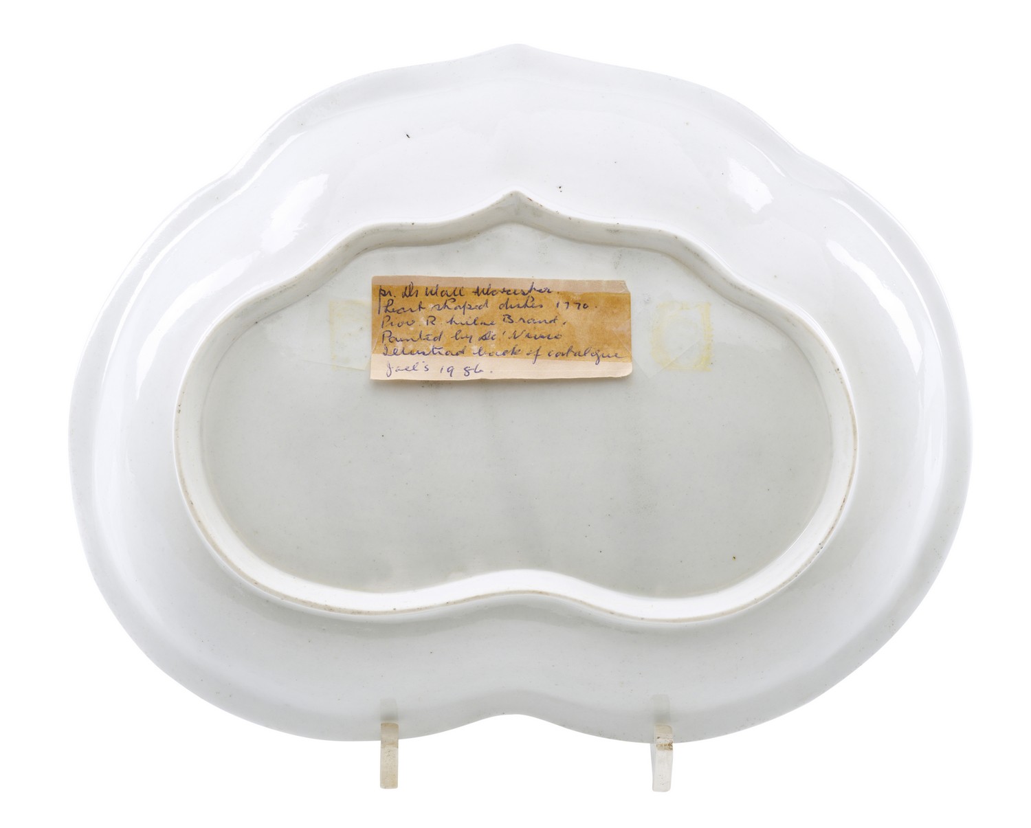 The leaf shaped dish, painted in polychrome enamels with exotic birds in landscape within scattered insects and gilt dentil border, in the manner of George Davis. Handwritten paper label to verso.