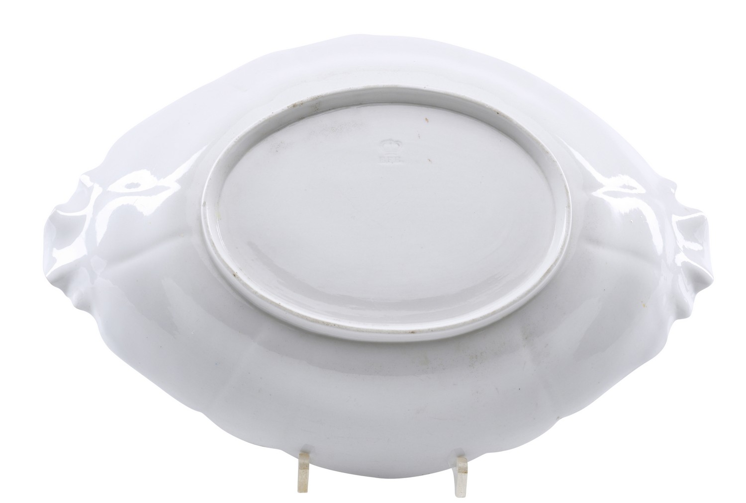 The lobed oval dish is finely printed en grisaille with vignettes of seashells and aquatic plants. Impressed FBB to reverse.