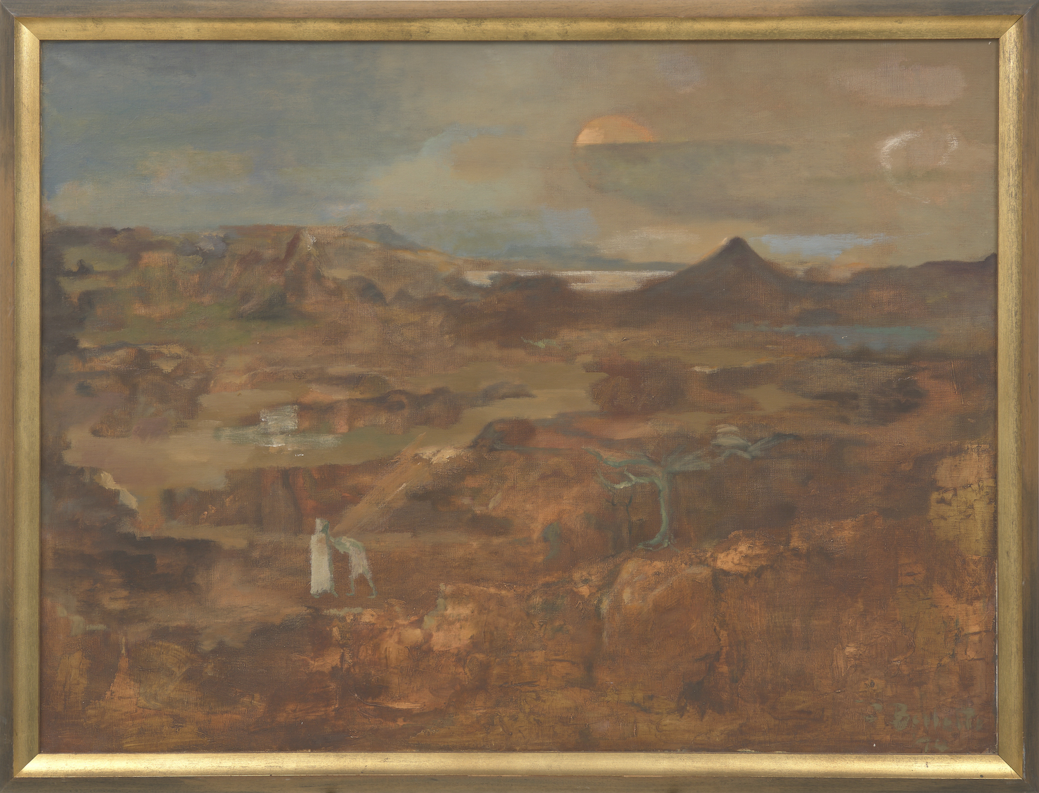 Work in very good condition. Two losses (very minor) are detected on the canvas. One pin-head sized located in the mid right hand center. The other in the shape of a line, located in the mid left (slightly lower) side. Well framed, overall size 100 x 130cm