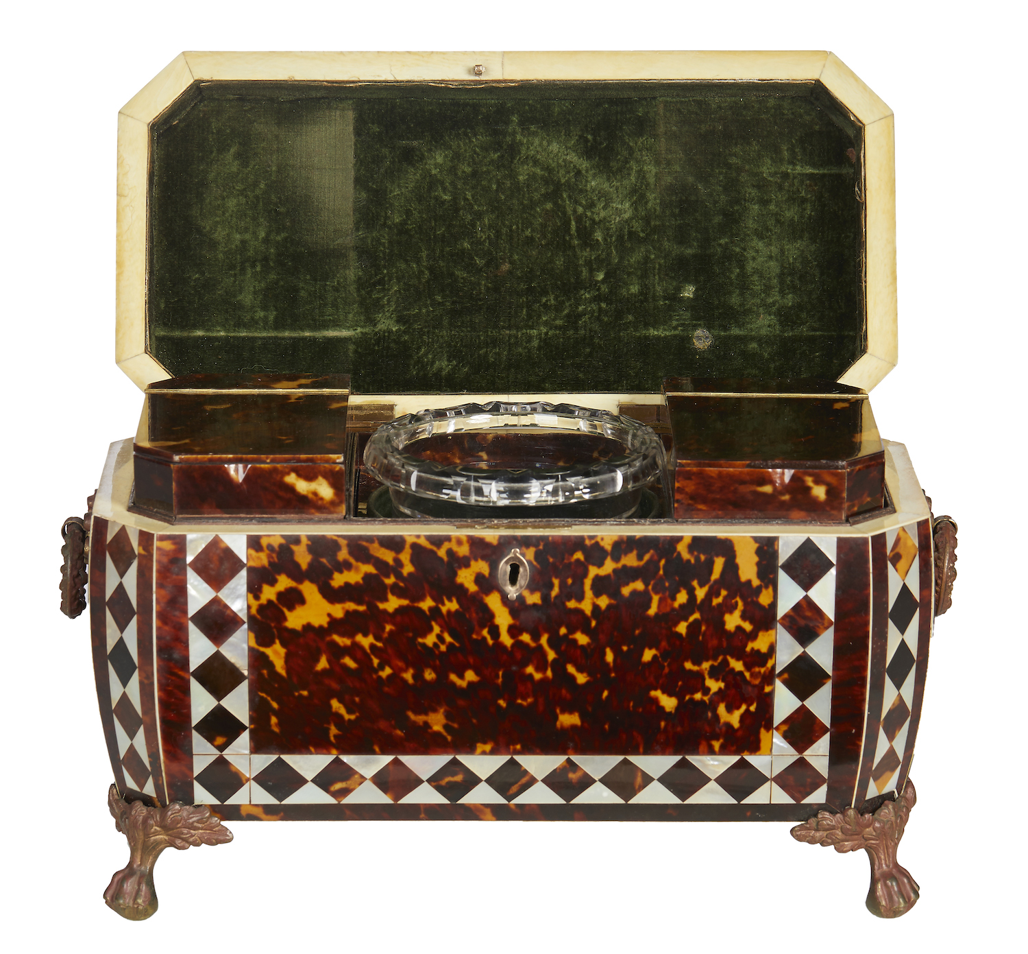The sarcophagus shaped body with canted corners fully veneered with mother of pearl and tortoiseshell in a lozenge design. The interior containing two partly veneered tortoiseshell tea cannisters and a mixing bowl. Gold hinges and escutcheon, pressed metal ring handles and cast iron ball and claw feet.
