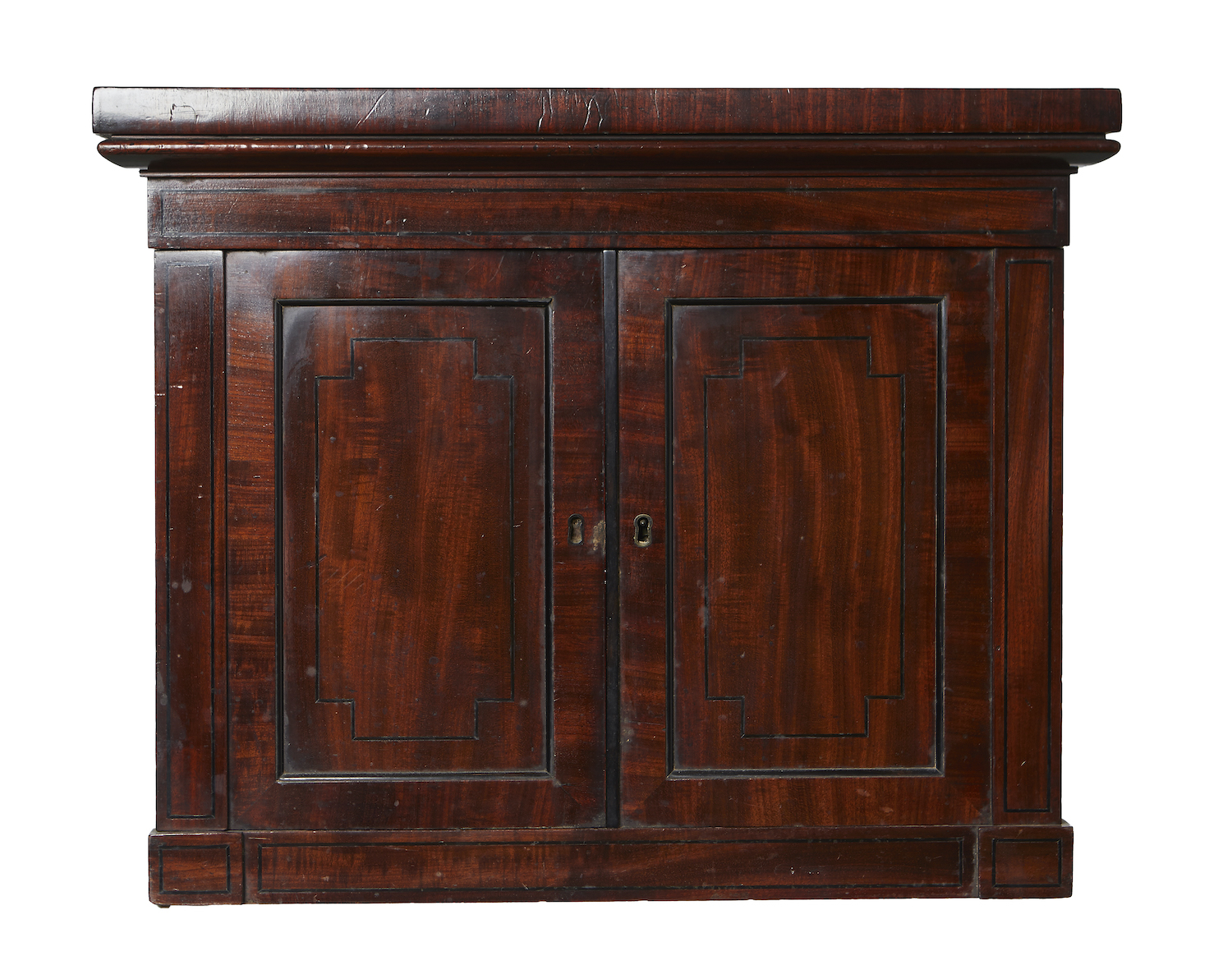 A tabletop cabinet in solid and veneered Cuban mahogany with ebony reeding and stringing, the two doors opening to reveal ten felt-lined specimen drawers with ebony button handles.