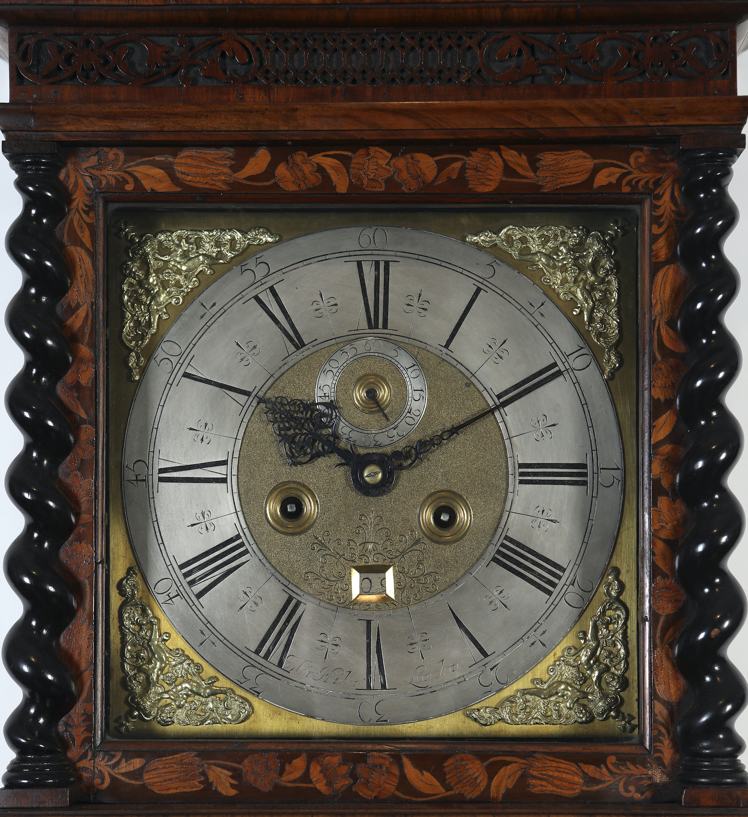 The eight day movement with anchor escapement striking brass dial and chapter ring signed 'Morgan Herbert, London'. The case with fine walnut veneers and elaborate marquetry depicting flowers, foliage, birds around a central urn of flowers. The hood with ebonised barley twist supports, caddy top with turned ebonised finials.