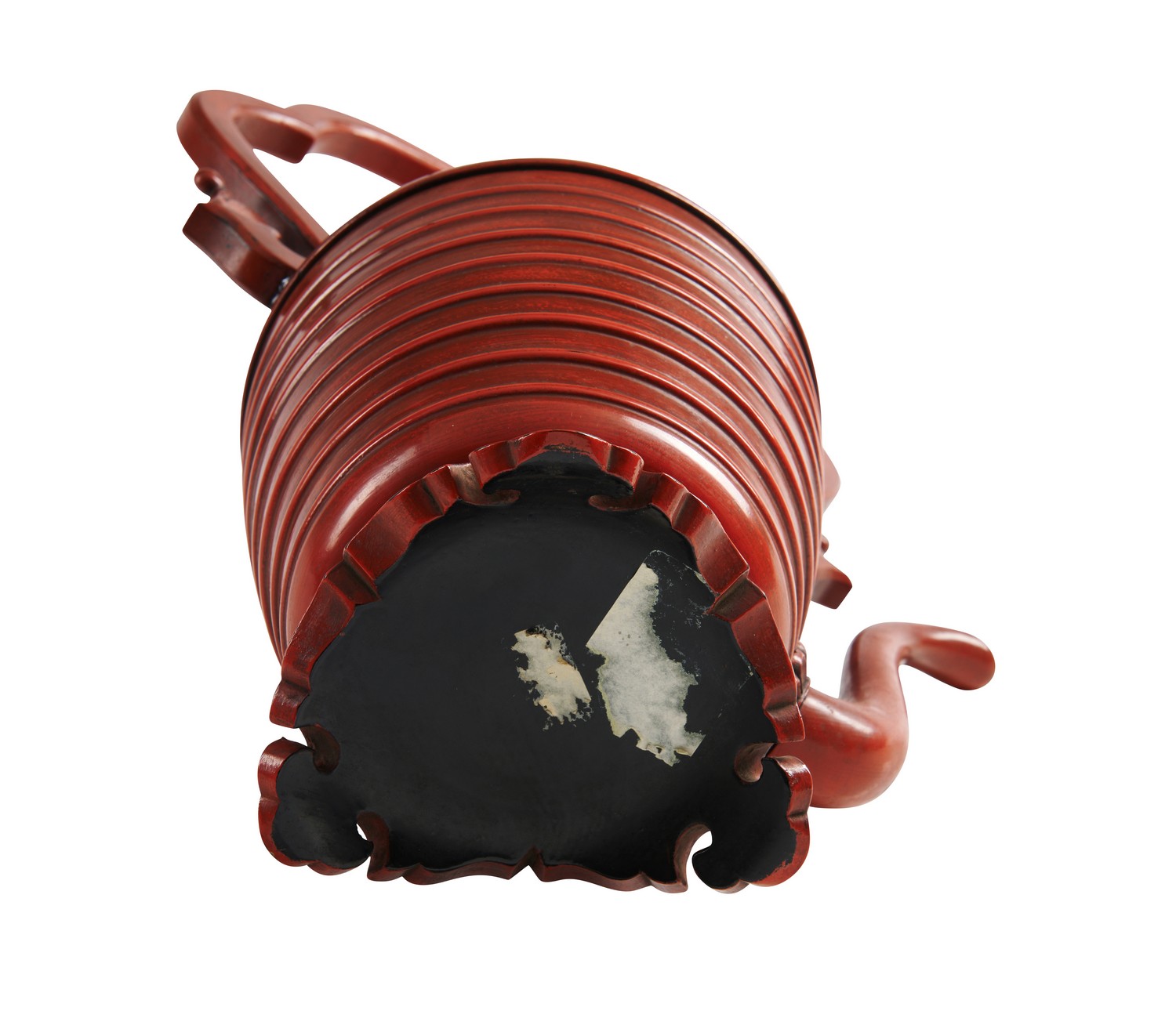 The ribbed cylindrical red and black lacquer-covered form with an overhead looped handle and a long spout sweeping up from a chrysanthemum floret.