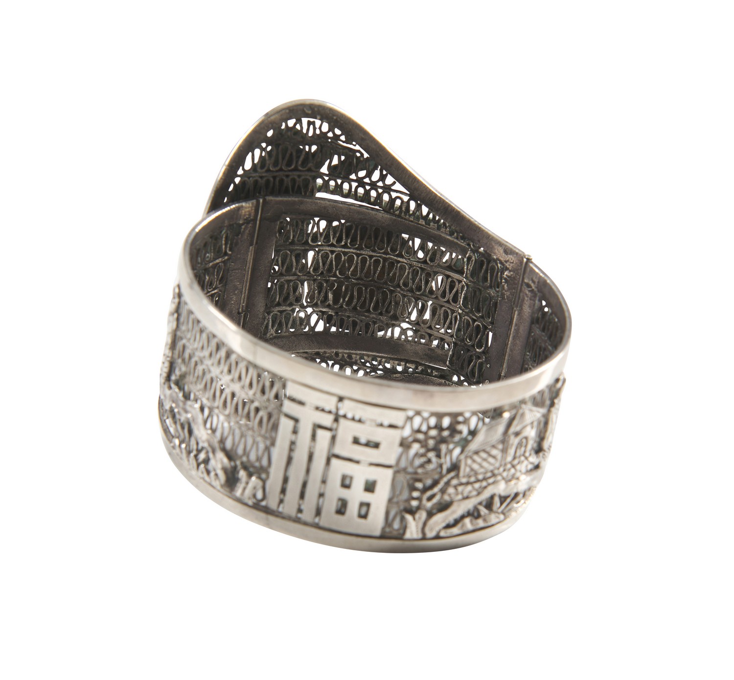 Of buckle form, with pierced repousse decoration of figures and buildings surrounding stylised characters including 'Shou'.