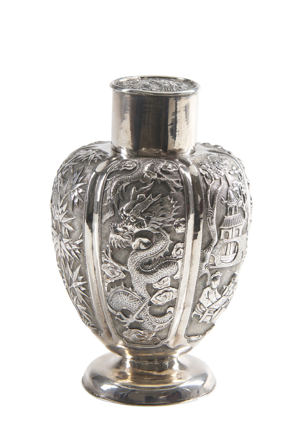 Decorated to the sides with alternating panels of flowers, dragons and landscapes in fine repousse work. Retail mark for Wo Shing, Shanghai.