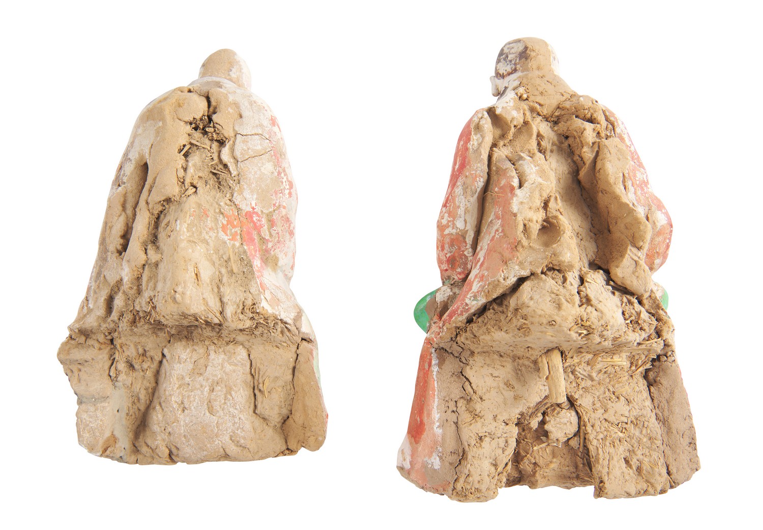 Modelled as seated figures with remnant polychrome decoration, one holding an open book. Together with fitted Chinese boxes.