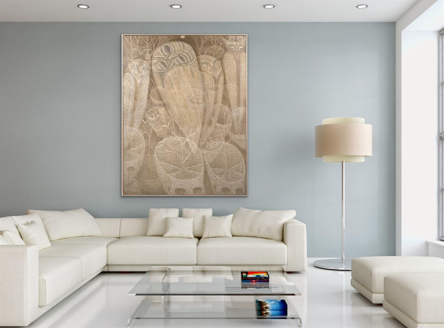 Work in very good condition, some light wear seen around the outer edges on all four corners. Work is housed in a light timber shadow box frame, measuring to be 195 x 156 x 6cm.