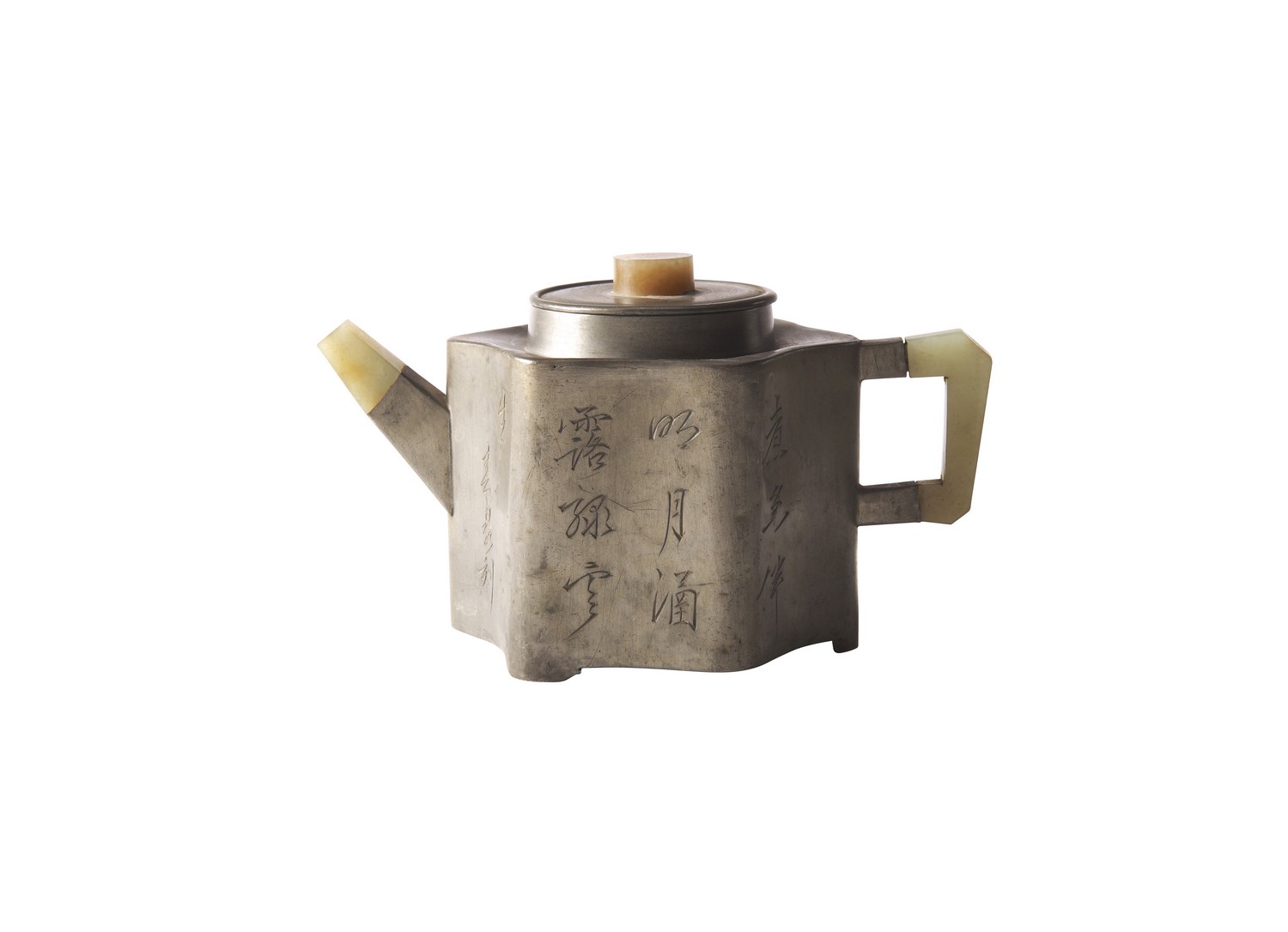 Of lobed hexagonal section, with a pale celadon jade handle, spout tip and finial, inscribed to one side, signed and with incised bamboo decoration to the reverse.