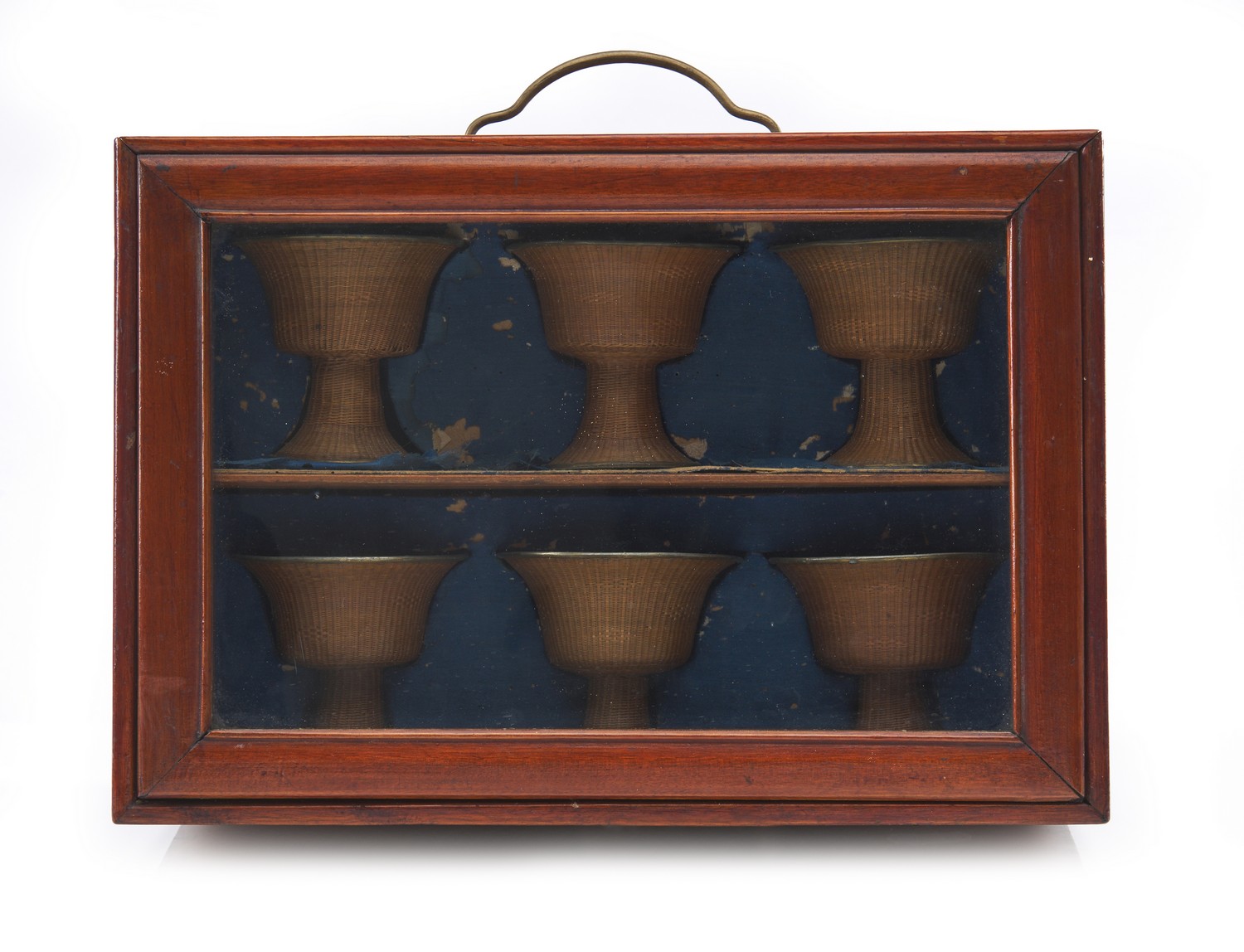 Some minor wear to the woven bamboo. One cup separated from its stem. Insect damage to the wooden box. Old wear and small damages to the cloth lining of the box. Approximately 2800 gms total weight including box.