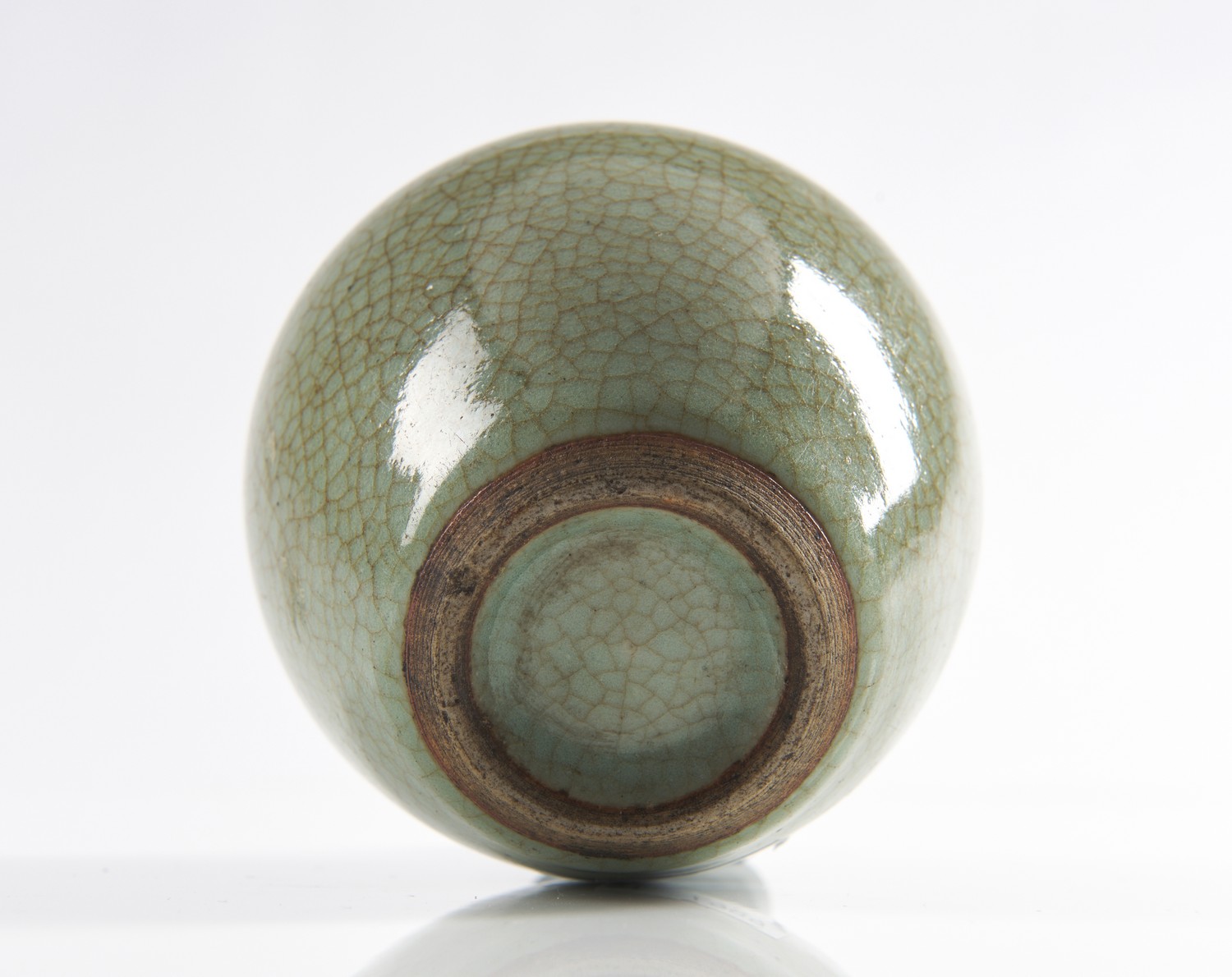 A ovoid vase with everted lip covered in a pale celadon glaze with a dense golden crackle.