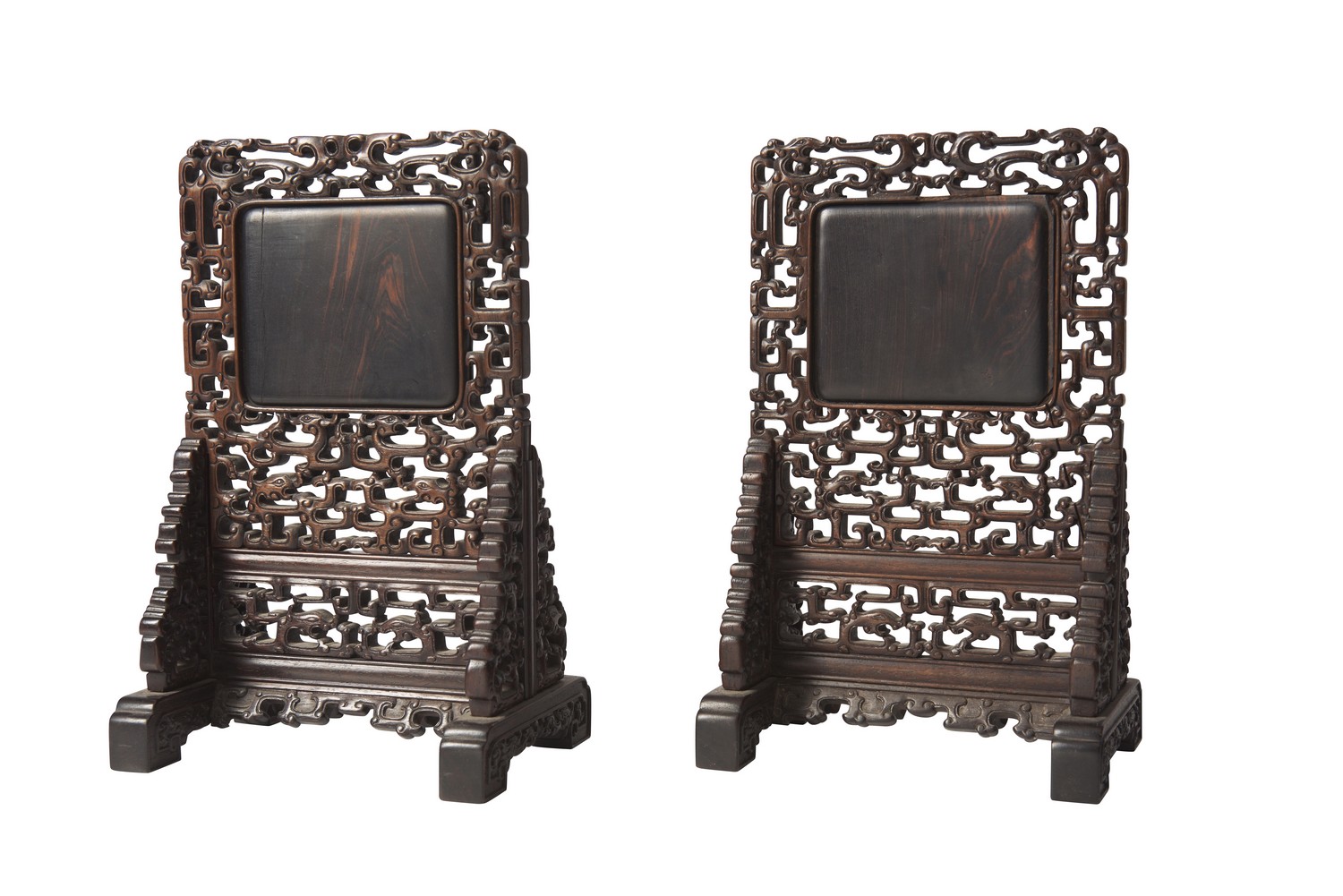 The black lacquer panels inlaid with hardstone and jade decoration of pomegranate and nandina, inset into intricately pierced hardwood table screens.