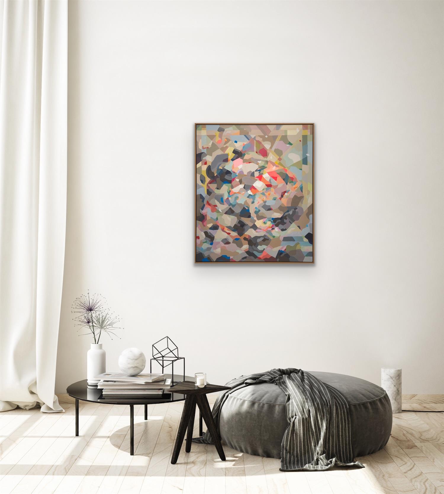 Work in very good condition. Faint black surface scuff (center right) is detected. Timber shadow box frame (in very good condition). Overall size: 104.5 x 89 x 5cm