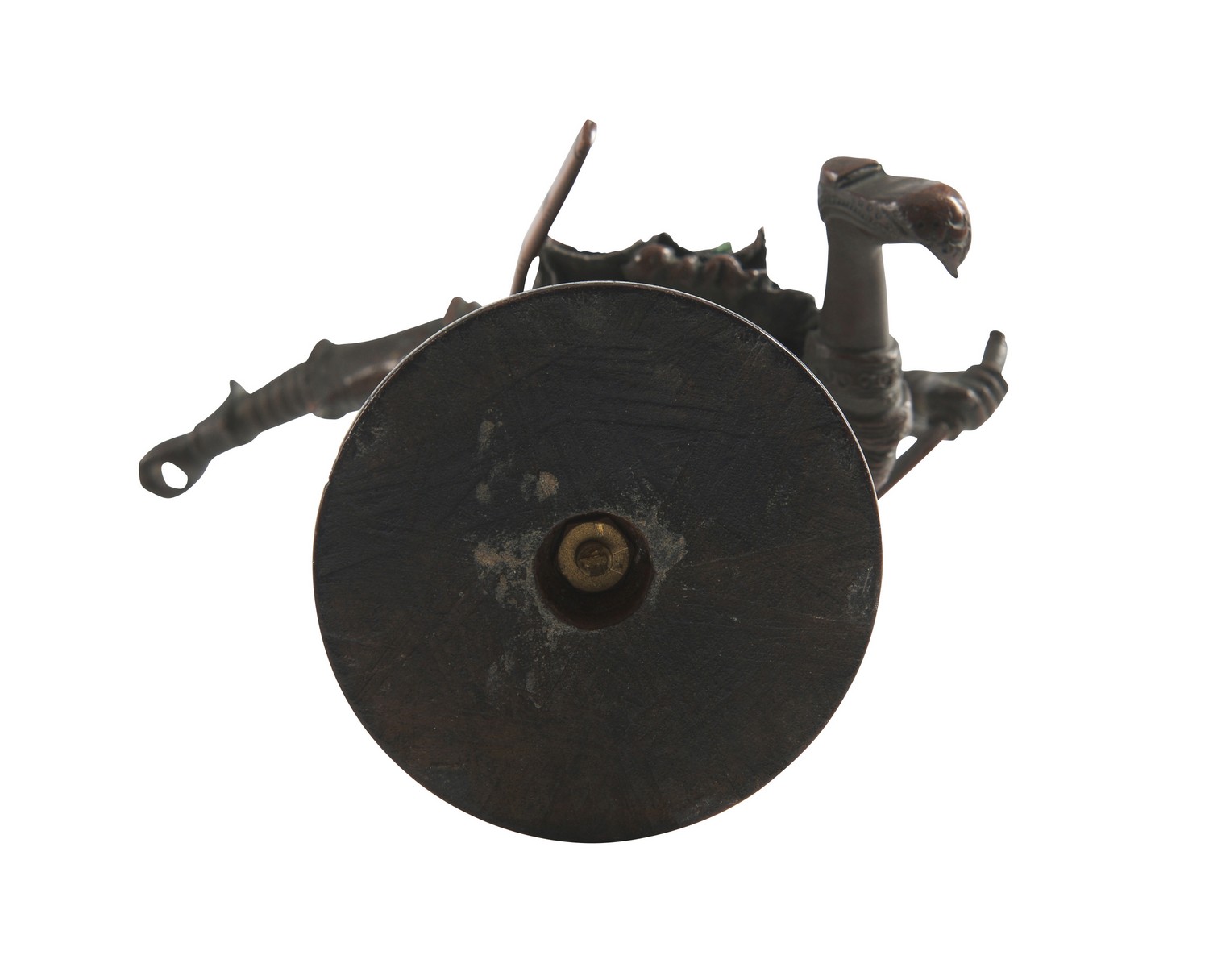 The finely cast figure depicted in elaborate ceremonial armour, standing on one leg, the right hand bearing a sword. On a wooden base with old patina.