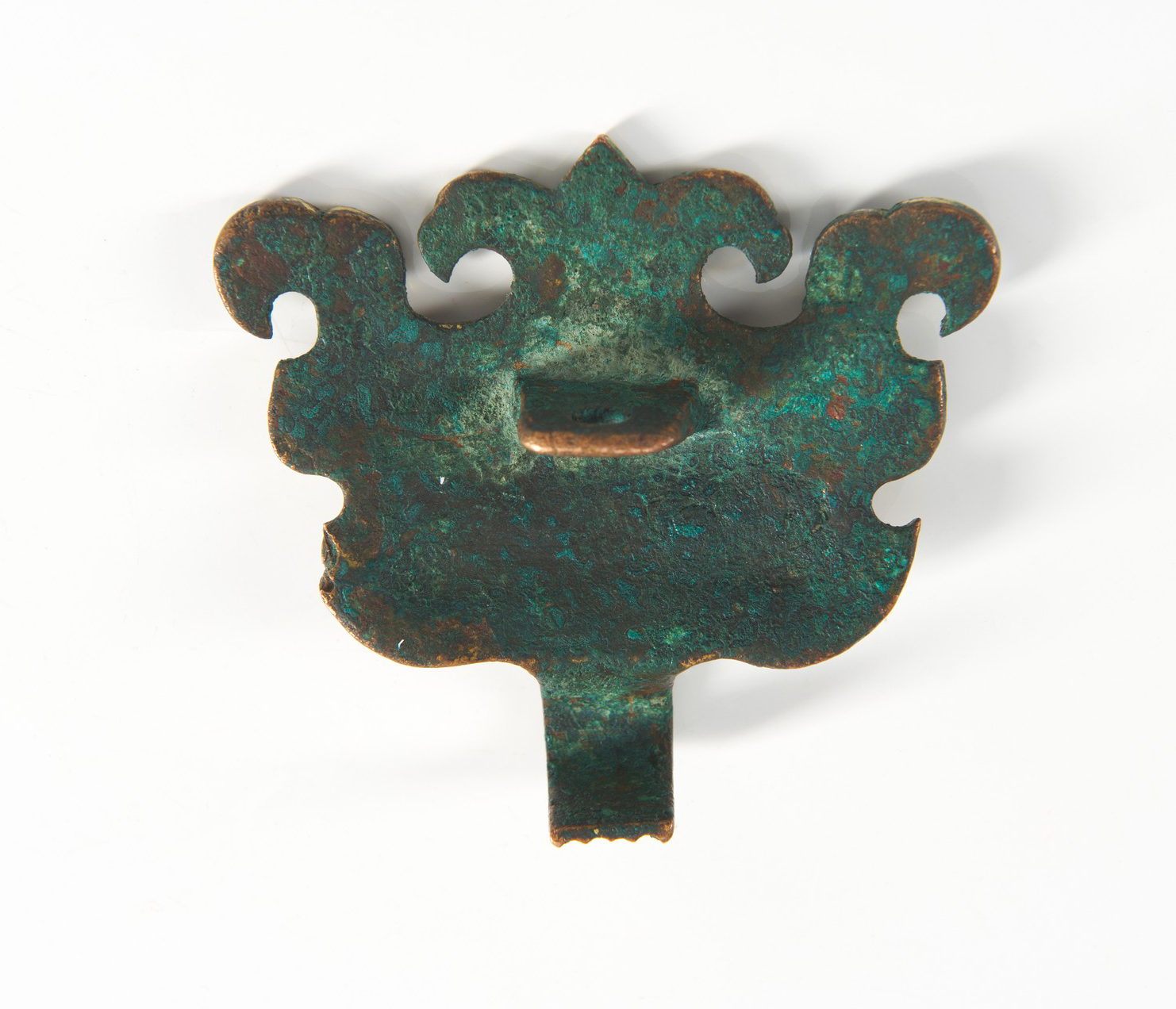 The taotie mask cast in bronze, with richly gilden face and verdigris encrustation.