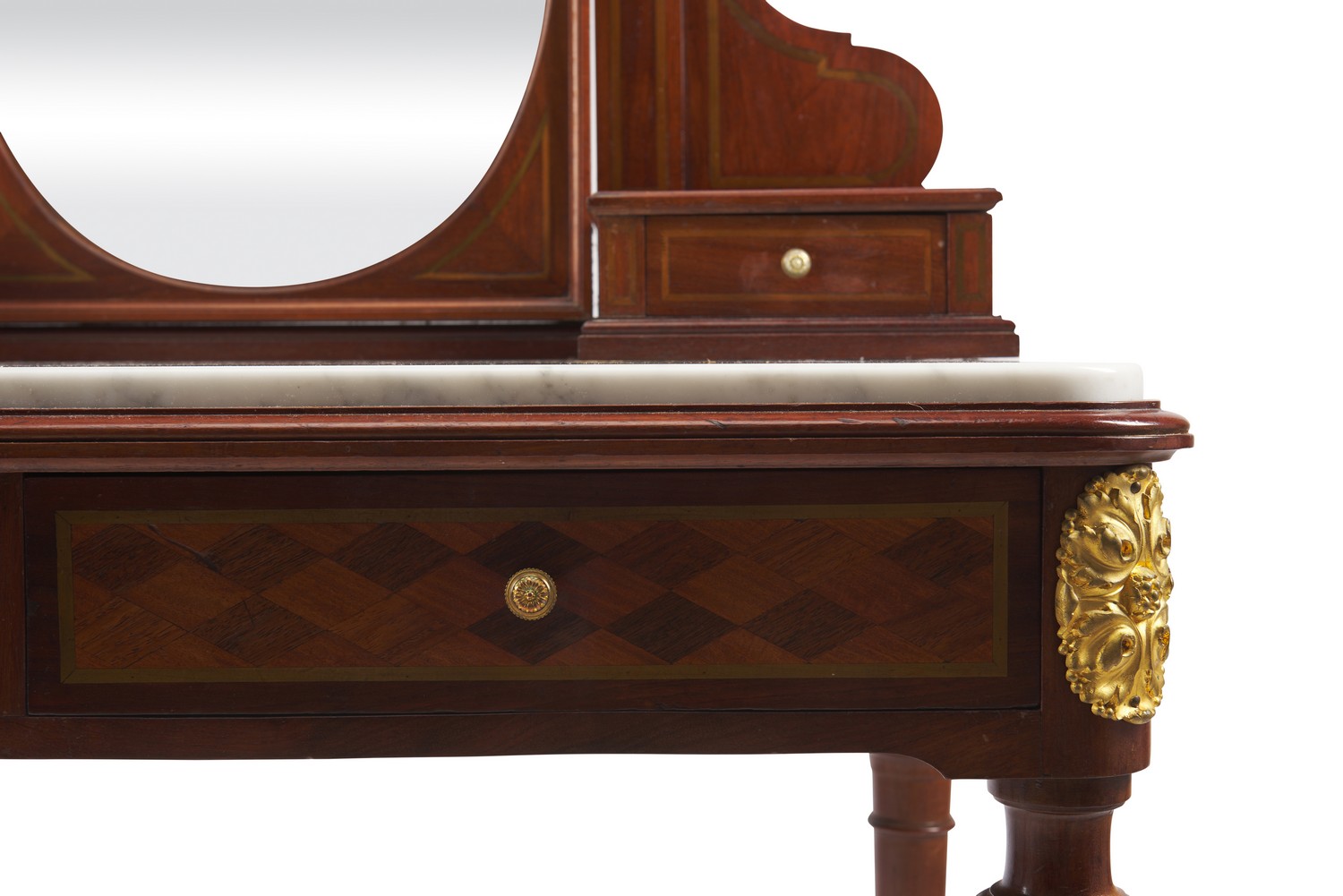 The upper body with a circular mirror inset into a rectangular frame with two classical inspired ormolu mounts to headboard joining to two small drawers, above a marble plate and two marquetry veneered drawers flanked by two further classical inspired ormolu mounts, and all raised on four tapering legs.