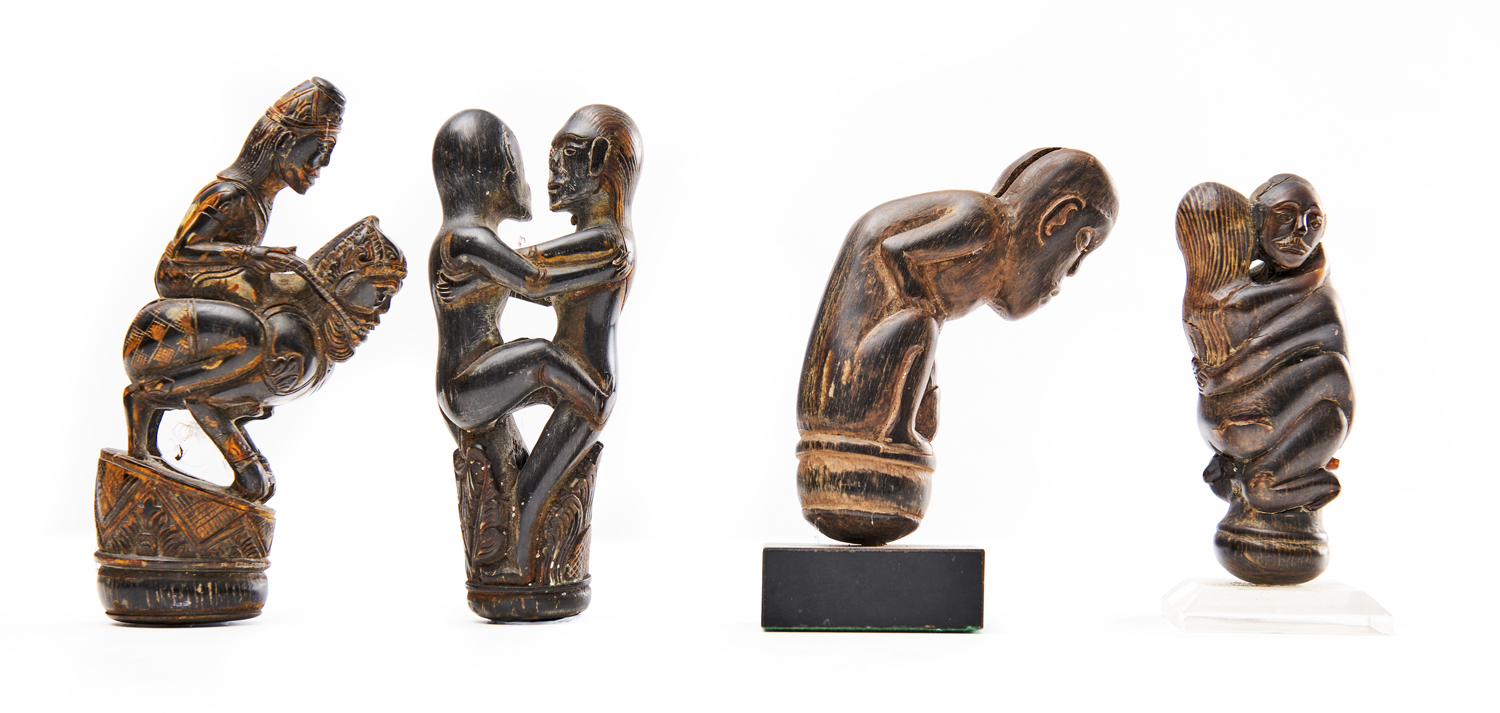 A COLLECTION OF FOUR INDONESIAN FIGURAL CARVED HORN HANDLES