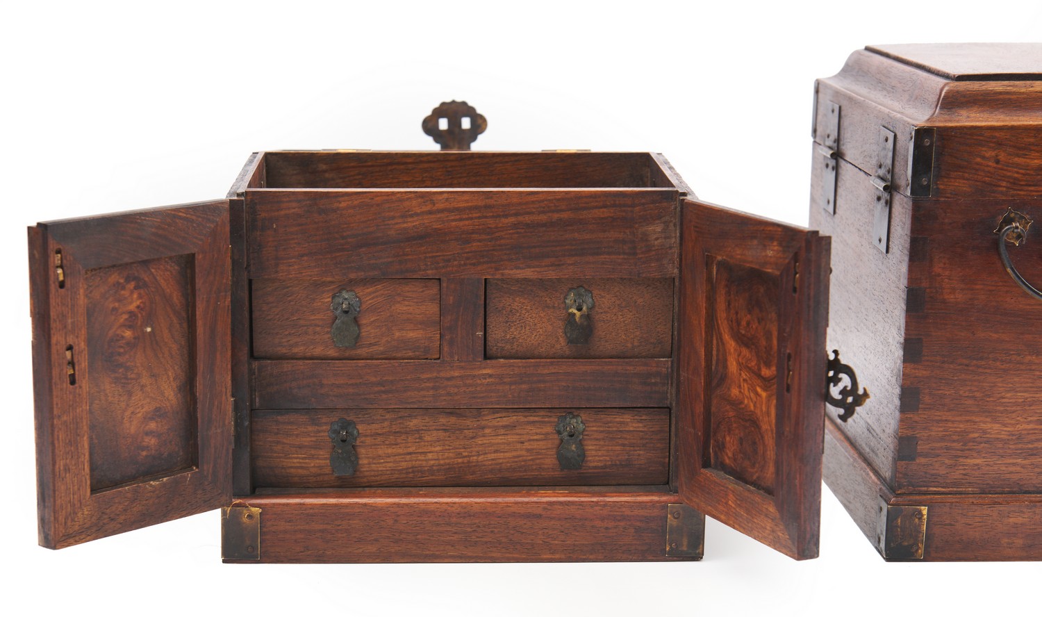 The small chests with doors to the front revealing drawers within, with a domed hinged lid and metal handles to either side.
