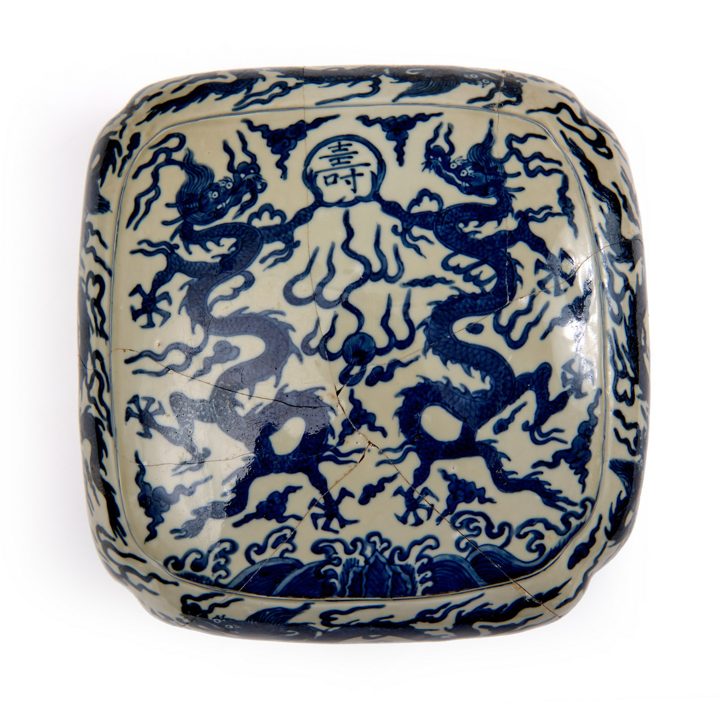 The domed lid with rounded corners decorated with five claw dragons chasing flaming pearls.