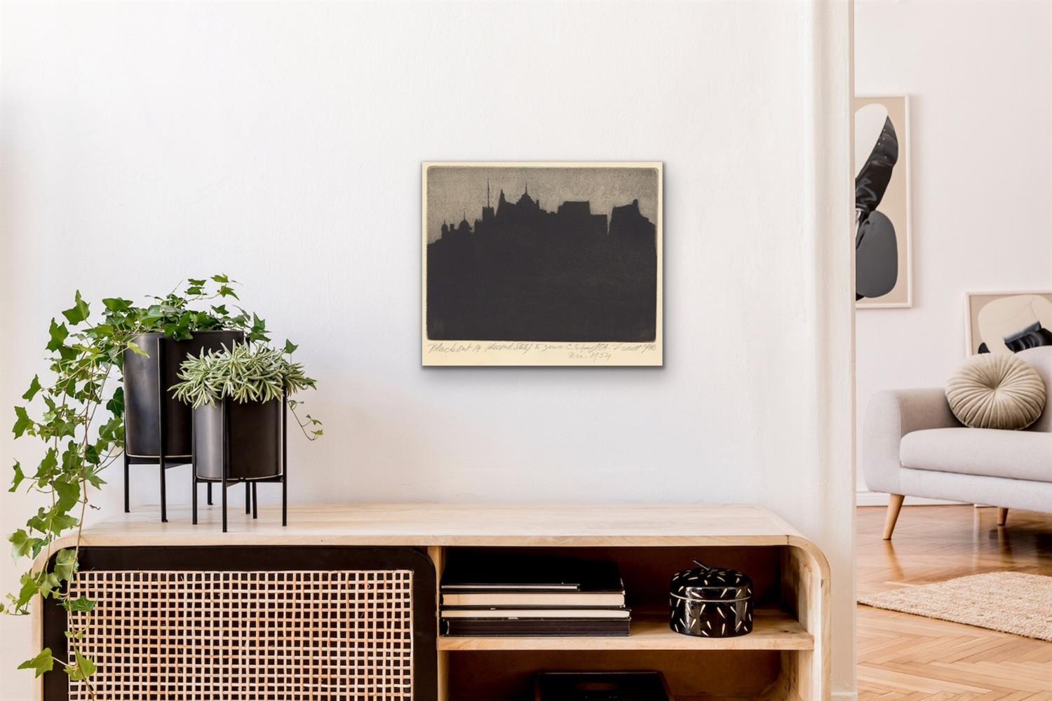 This artwork is in fair condition. The print itself in good condition and true to age. The paper bears handling marks and creases throughout. Paper has curled at the egdes. There is a light brown stain at the top right (approx. 1cm) above the print.