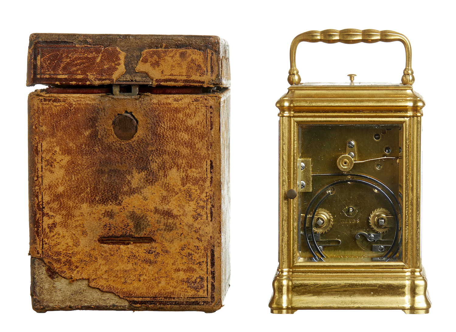 With white enamel roman numeral dial, blued steel moon hands. An 8 day movement. The enamel dial marked 'Payne & Co. 163 New Bond St, London'. Also engraved on the back plate. With original leather travelling case and key.