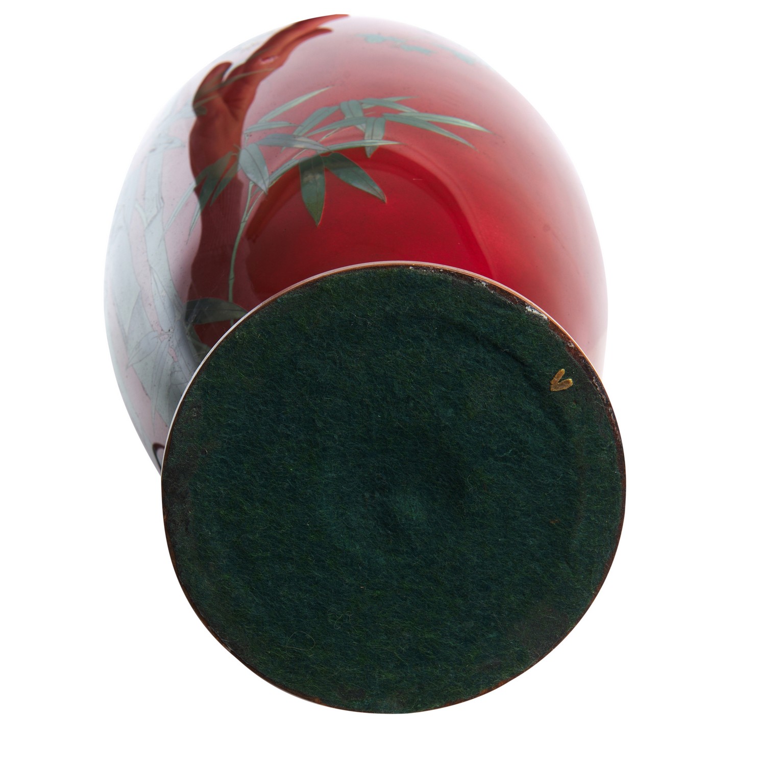 The tapering vase, decorated with flowering bamboo against a red ground. No shade