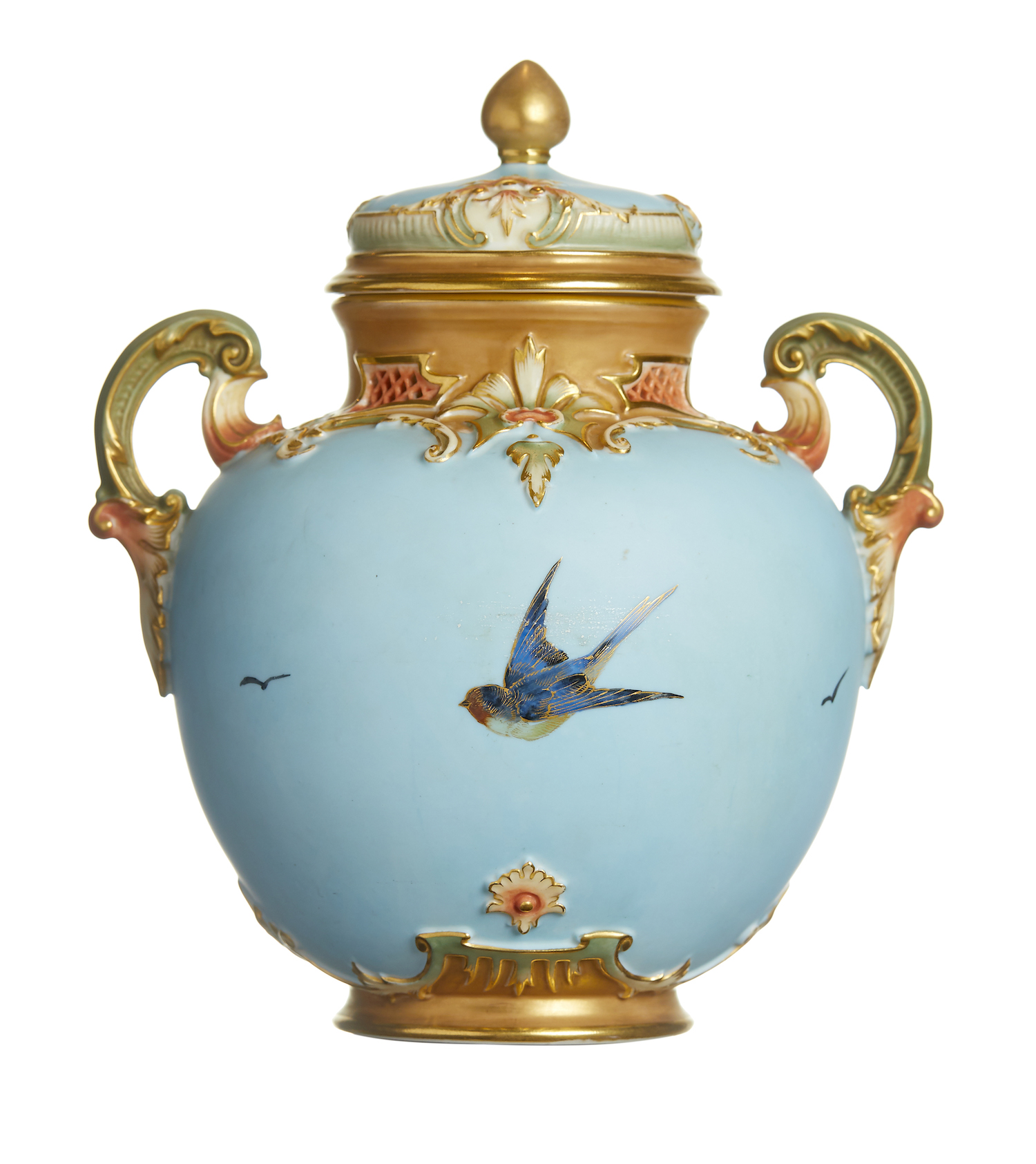 Painted with swans in flight above grasses and gilt reeds against an azure blue ground, and a swallow on the reverse. Printed factory marks. Rd number 168915, shape number 1515.