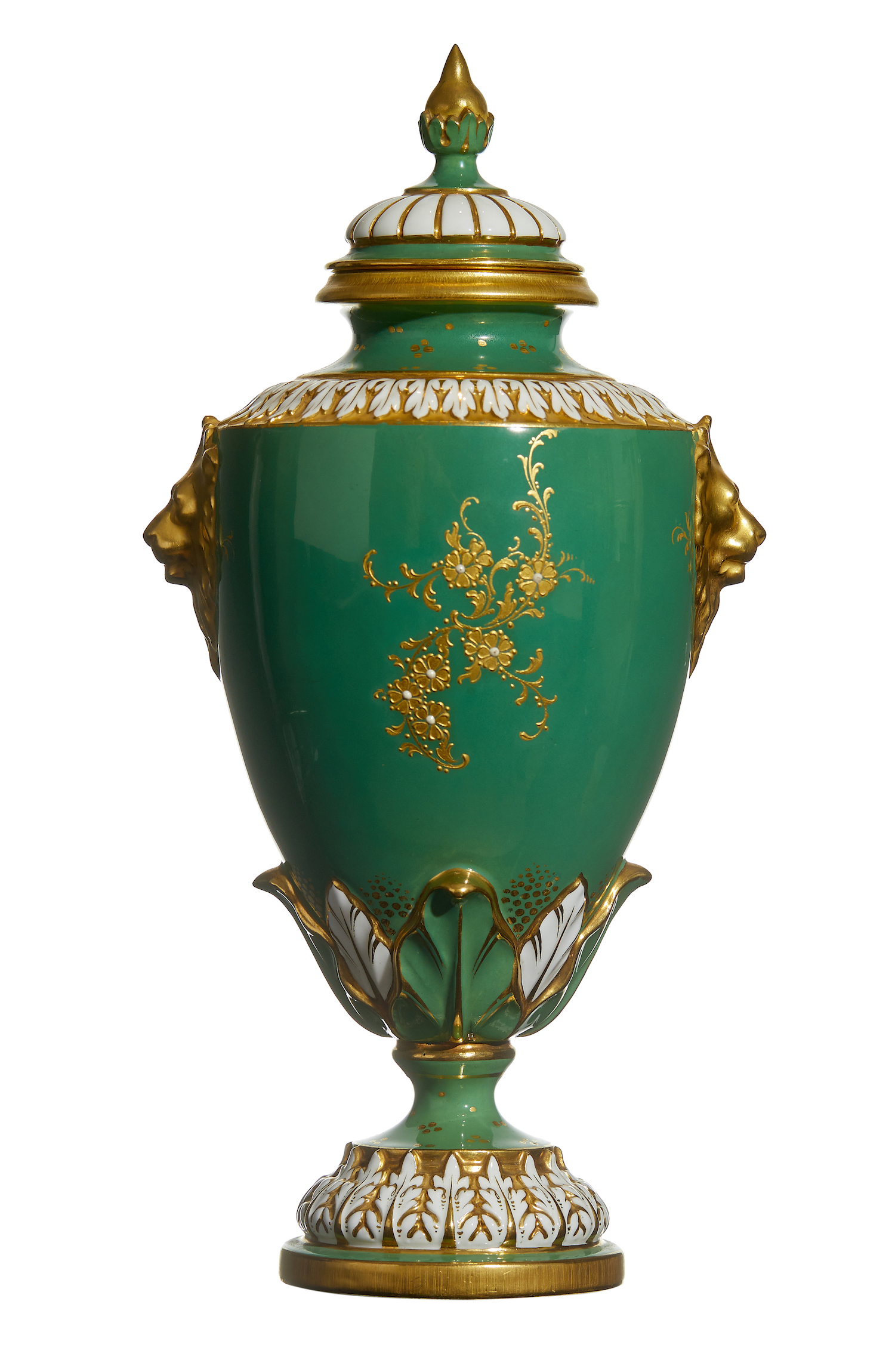 Painted with peaches and grapes within gilt floral scroll border, lion mask handles. Printed factory marks. Shape number 2305.