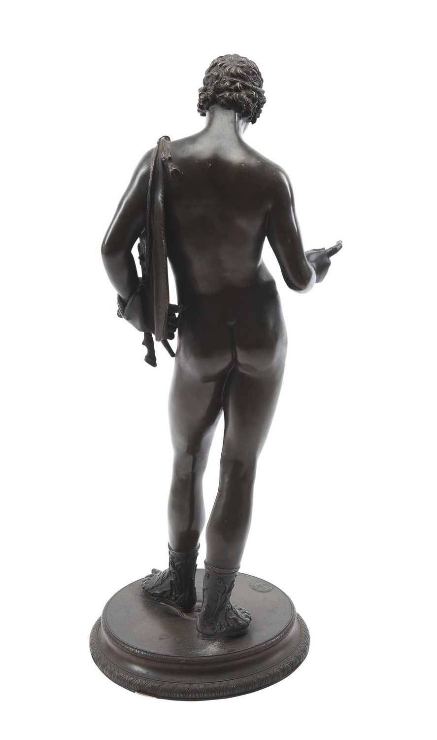 Modelled in contraapposto, with an animal skin draped over his shoulder. Bearing a circular plaque to the base 'Fonderia Di Ferroe bronzo di Francesco De Luca, Napoli'