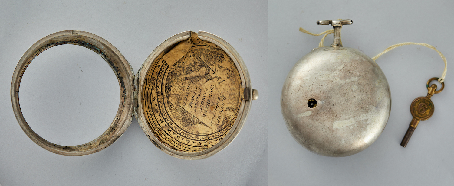 Full plate brass movement, silver regulation, square baluster pillars, movement signed 'Gerrit Bramer, Amsterdam'. White enamel dial with Roman arcaded chapter ring with outer five minute divisions, gilt hands, plain silver inner and outer casing.