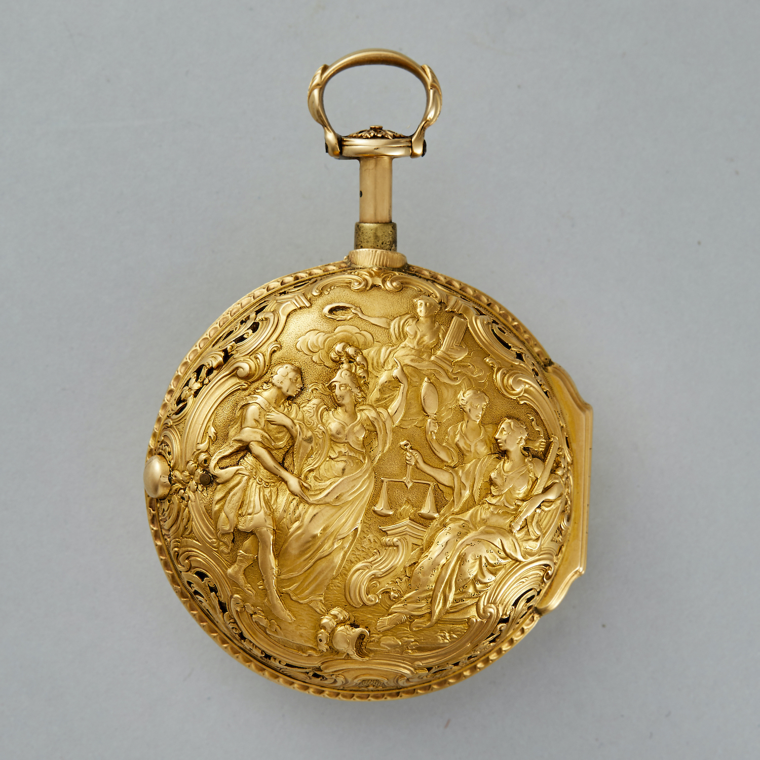 Gilt metal full plate cylinder movement with finely engraved and pierced balance cock. The movement signed 'Eardley Norton London' and numbered 2668. The white enamel dial with Arabic numerals, gold 'arrow' hands. The pierced and engraved gold inner case hallmarked London 1769. The gilt metal repousse outer case depicting a classical scene of justice. The cloth to the inside 'To a friend' and hand written 'I. B. Marshall. A small token of Brotherhood T. M.' with a black leather traveling case.