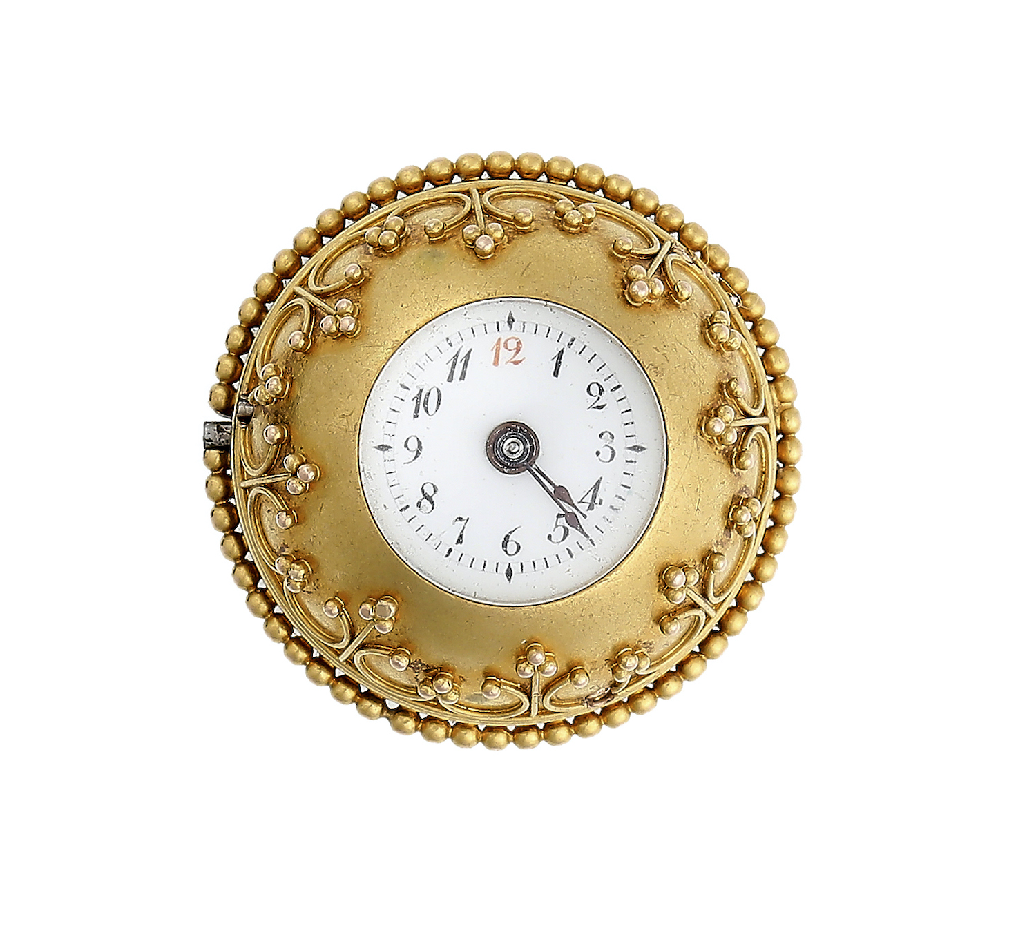 Gilt finished lever movement, white enamel dial, red and blue Arabic numerals, ball shaped case with scroll ornaments.