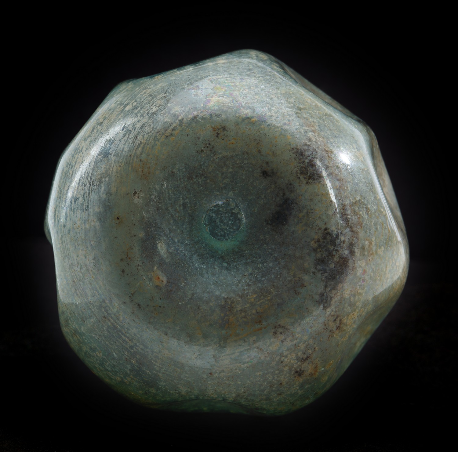 Intact with areas of iridescent patina