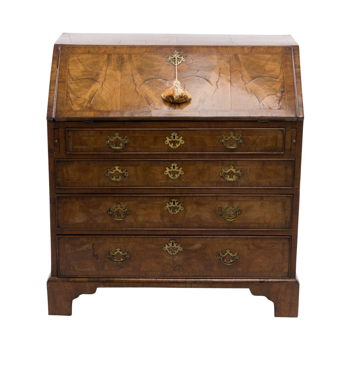 The rectangular top above a drop front writing surface enclosing an interior fitted with drawers, pigeon holes and storage compartments, the lower section with an arrangement of four long cockbeaded drawers with brass drop ring handles, the whole with walnut veneer and cross banded inlay, raised on bracket supports
