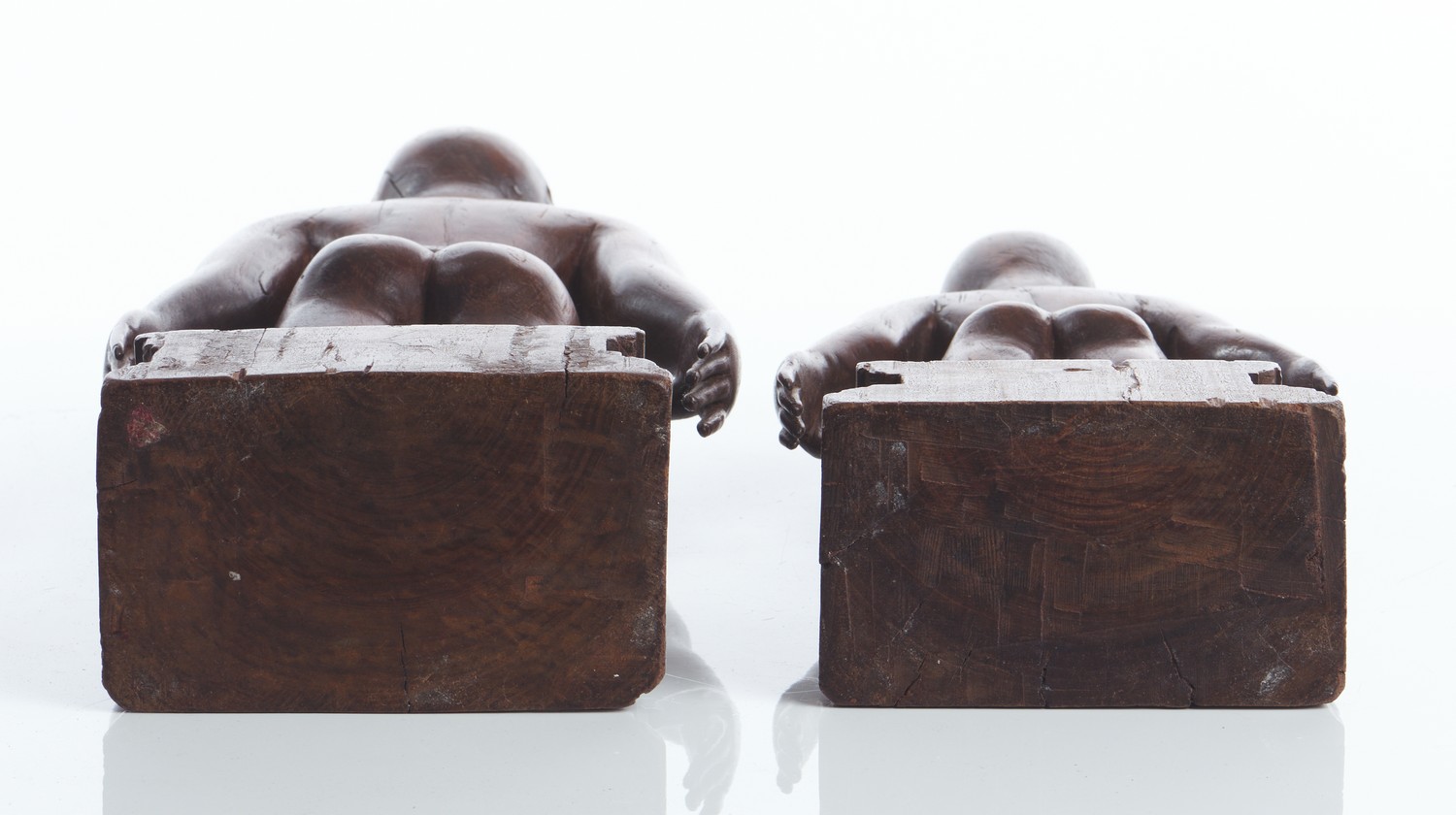 The male and female primordial deities depicted naked with arms stretched down at their sides, raised on integral plinth bases, finely carved from a dense hardwood.
