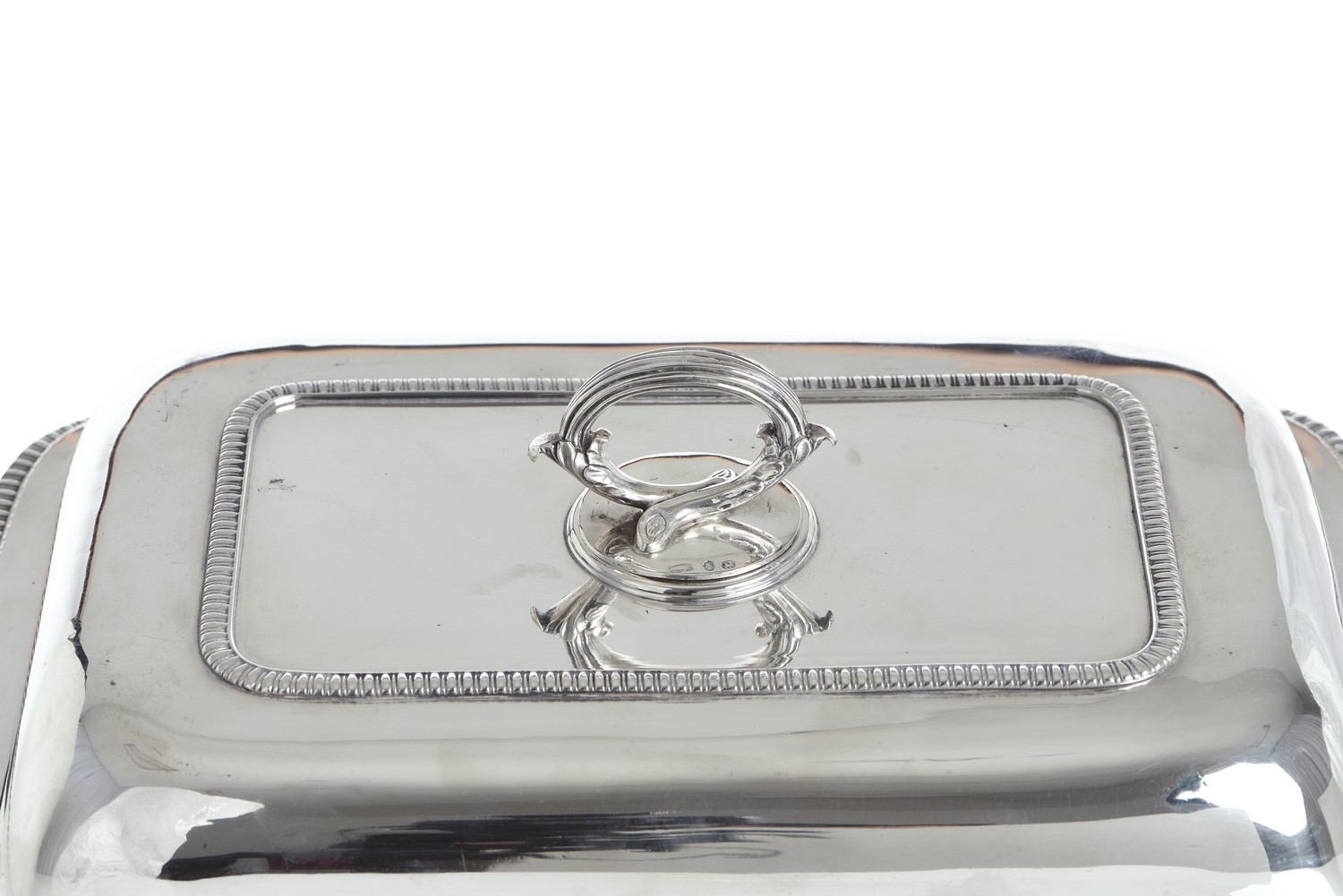 The rectangular dish with rounded corners, and a gadrooned rim, with a removable branch-form loop handle. Hallmarked to each piece, some marks rubbed.