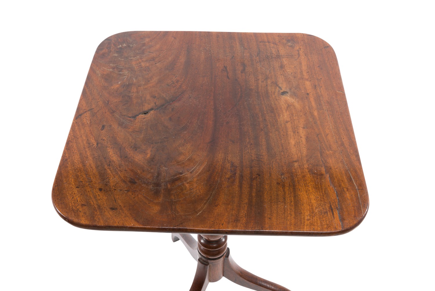 The square table top with rounded edges, raised on a turned stem and tripod base.