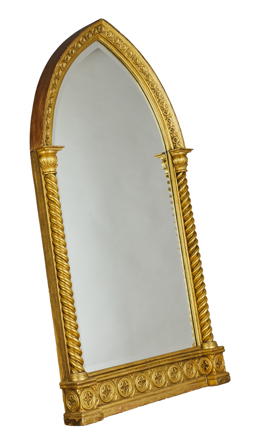 The bevelled plate of ogee outline the frame with quatrefoil moulding supported by a pair of spiral columns with foliate capitals.